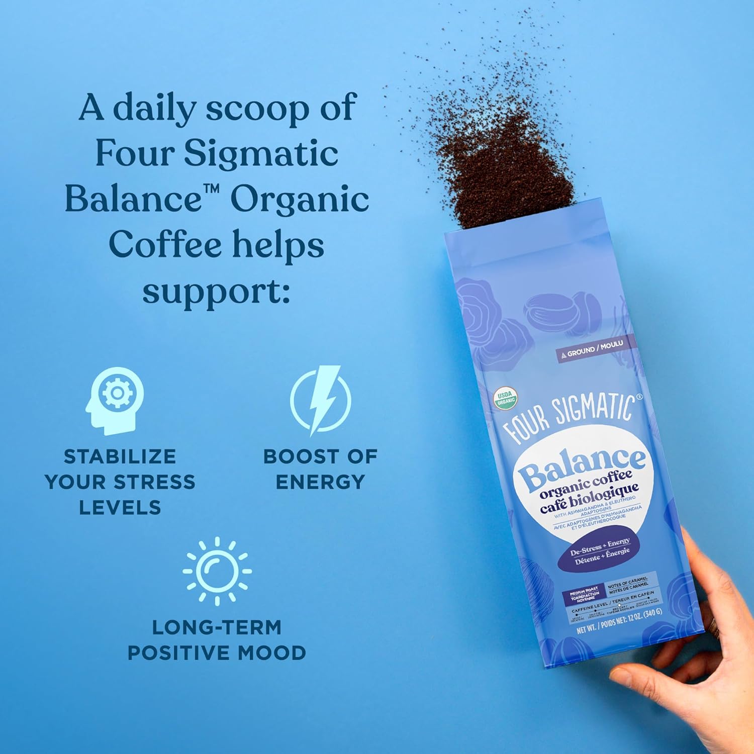 Four Sigmatic 有机平衡适应原研磨咖啡 | 中度烘焙 USDA 有机咖啡,含南非醉茄、白桦茸、刺五加和圣罗勒 | 提升专注力和能量的咖啡 | 12 盎司/袋