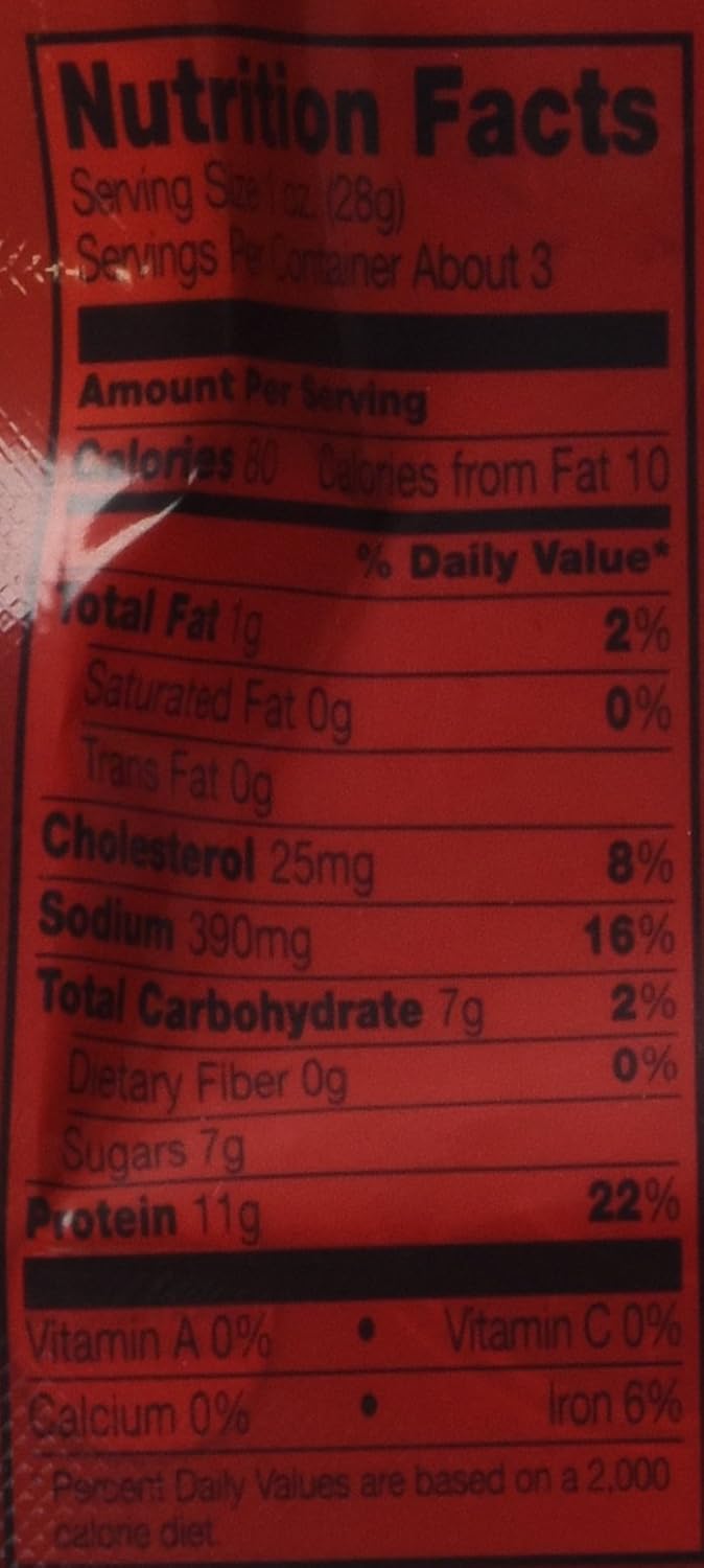 98% 无脂肪;11 克蛋白质;7 克总碳水化合物;不含味精、人工防腐剂或硝酸钠;四包,2.85 盎司(共 11.4 盎司);97% 无脂肪;14 克蛋白质;不含人工防腐剂;不含硝酸钠
