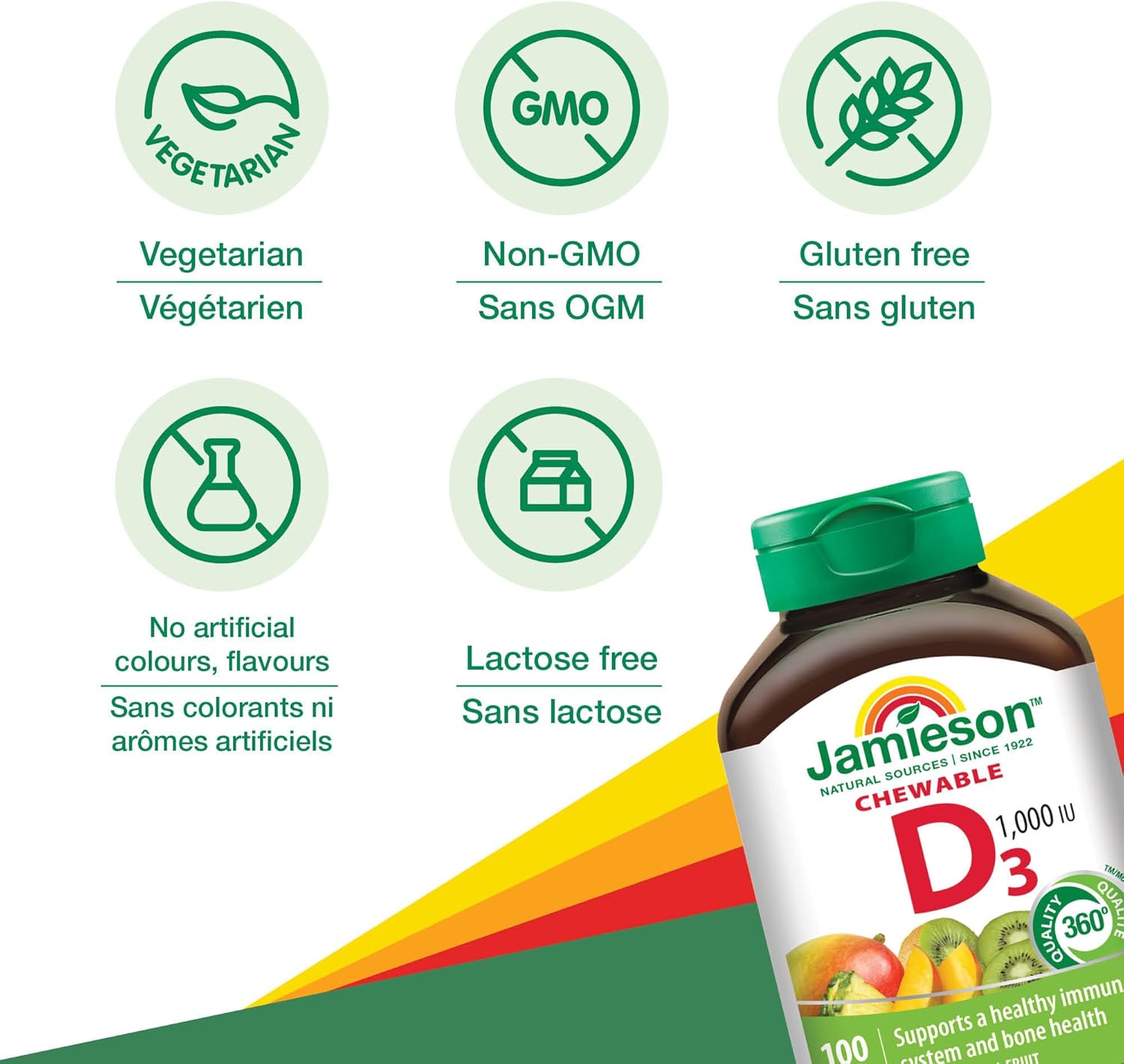 Jamieson 咀嚼维生素 D3 1000 国际单位,热带水果口味,支持免疫健康,强健骨骼和牙齿。素食,非转基因,无麸质,无人工香料和色素,100 粒,加拿大制造