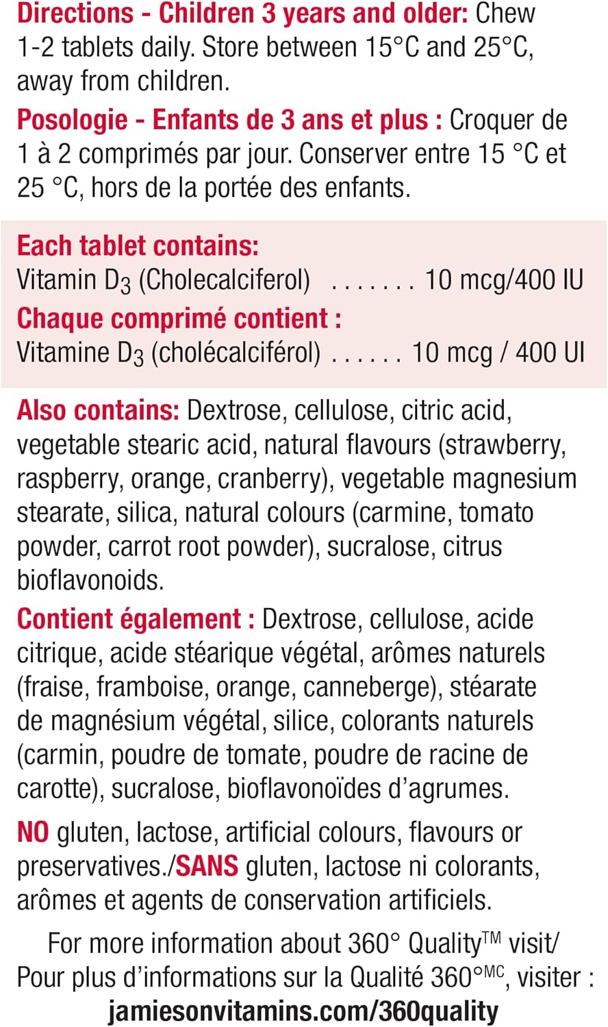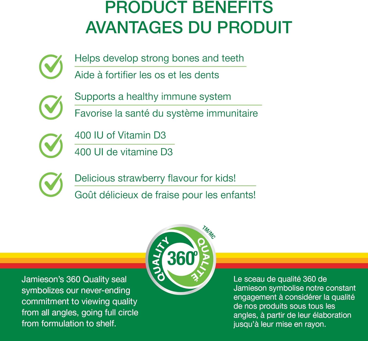 Jamieson 儿童咀嚼片维生素 D3 400 国际单位,草莓味,支持骨骼和牙齿健康发育,增强免疫力。素食,无麸质,不含人工色素、香精或防腐剂,100 粒装