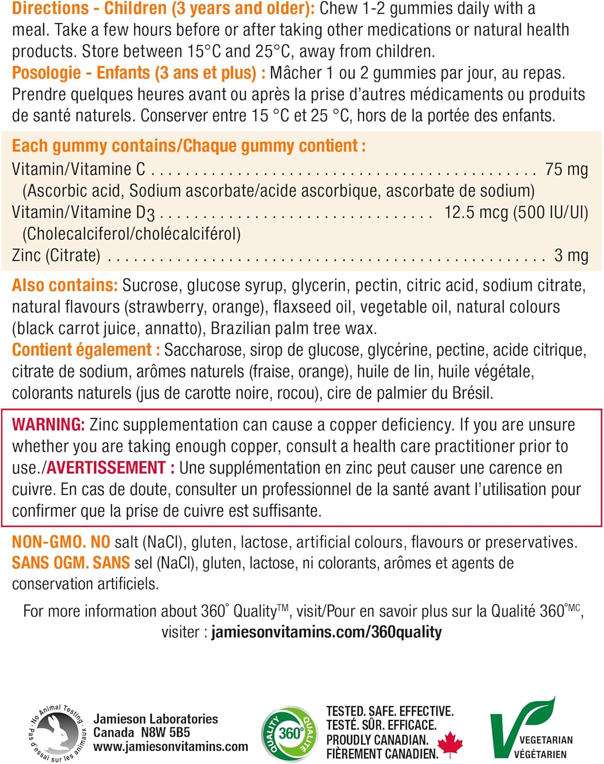 Jamieson 儿童免疫软糖,含维生素C、维生素D3和锌,草莓和橙子口味,有助于增强免疫力,强健牙齿和骨骼,促进伤口愈合。素食,非转基因,不含明胶,不含麸质,不含……