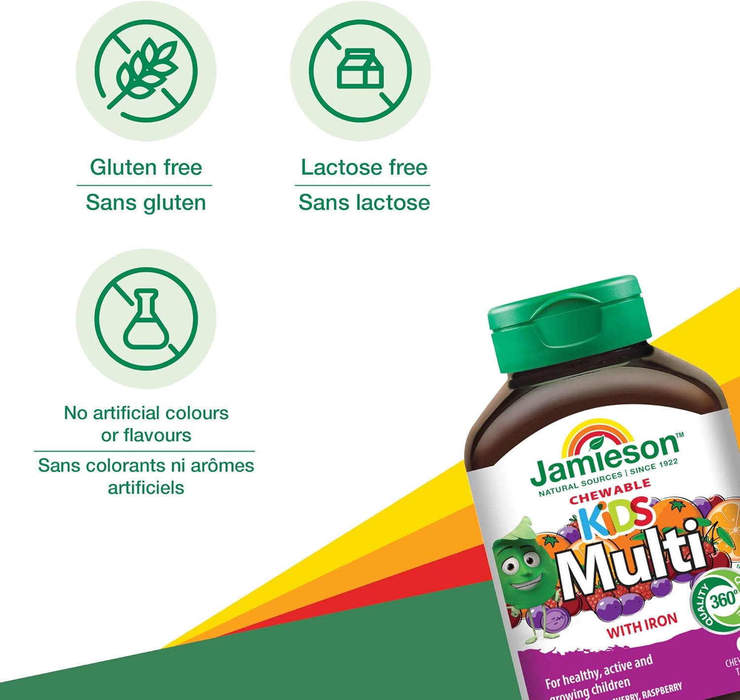Jamieson 儿童复合维生素咀嚼片,橙子、葡萄、樱桃和覆盆子口味,促进生长发育,强健骨骼和牙齿。预防缺铁,易于消化,无麸质、无乳糖、无添加剂……