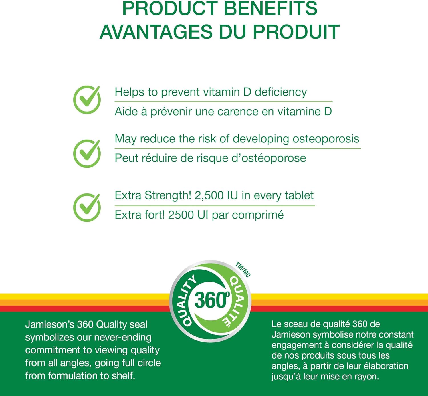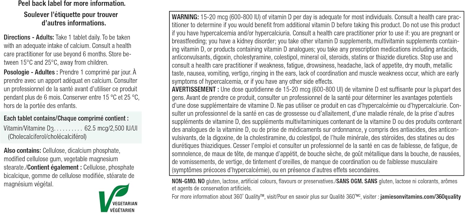 Jamieson 超强维生素 D3 为您提供 2,500 IU 非转基因维生素 D。这种强效配方是通过方便的每日药片来增加维生素 D 摄入量的绝佳方式。