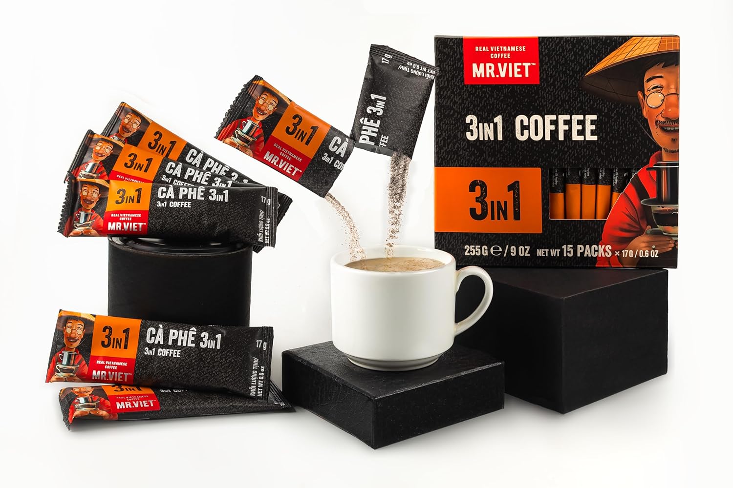 Mr.Viet 三合一速溶咖啡,采用正宗越南咖啡、奶油和糖。完美混合,方便您享用,这款多合一速溶咖啡能让您品尝到一杯真正美味、令人满足的正宗越南咖啡。