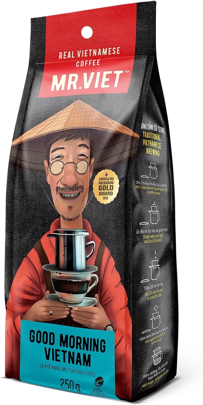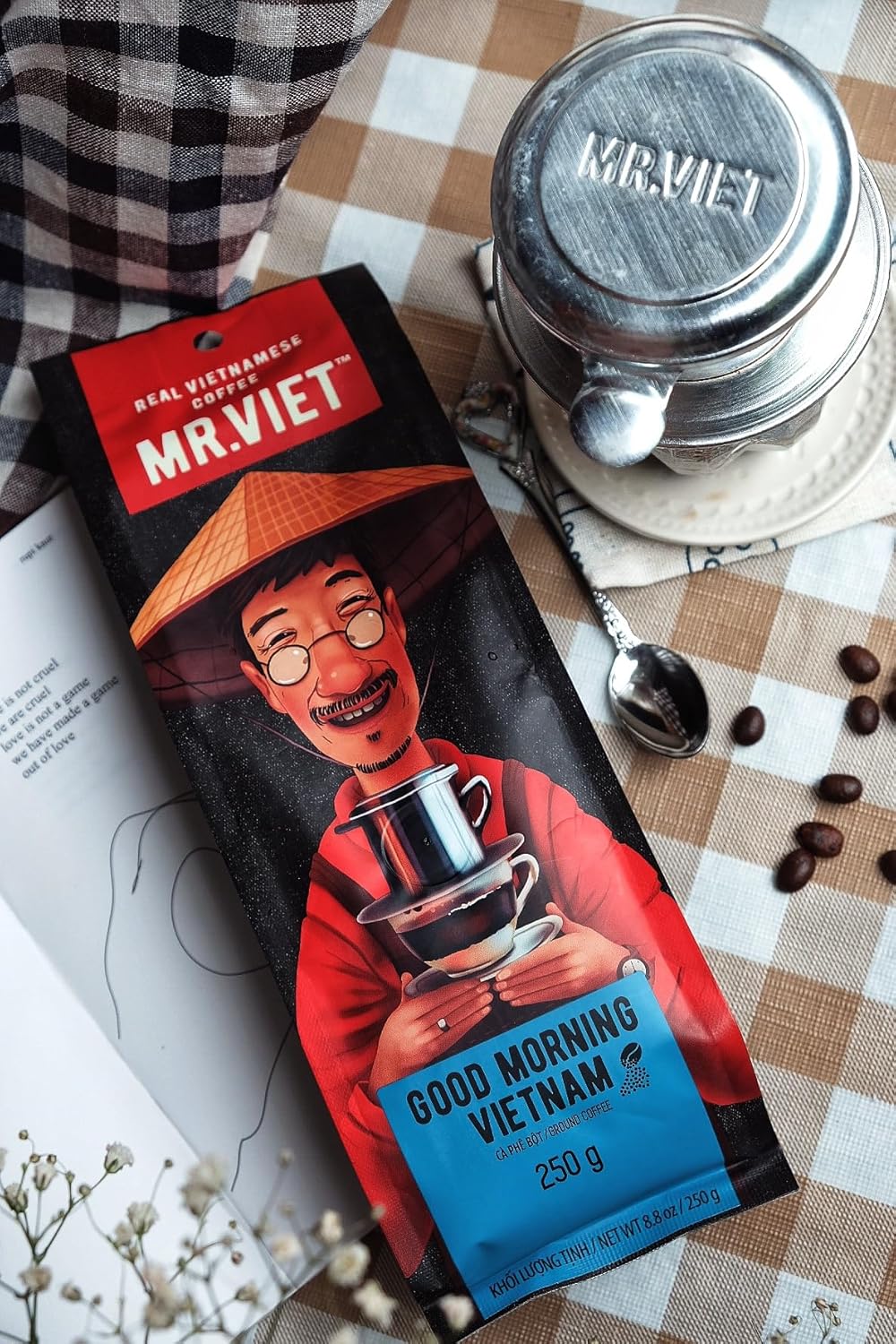 Mr.Viet 正宗早安越南咖啡具有浓郁的面包味、坚果味以及苦可可和烤谷物的味道。经过完美烘焙,咖啡爱好者将体验到越南咖啡的优质正宗味道。
