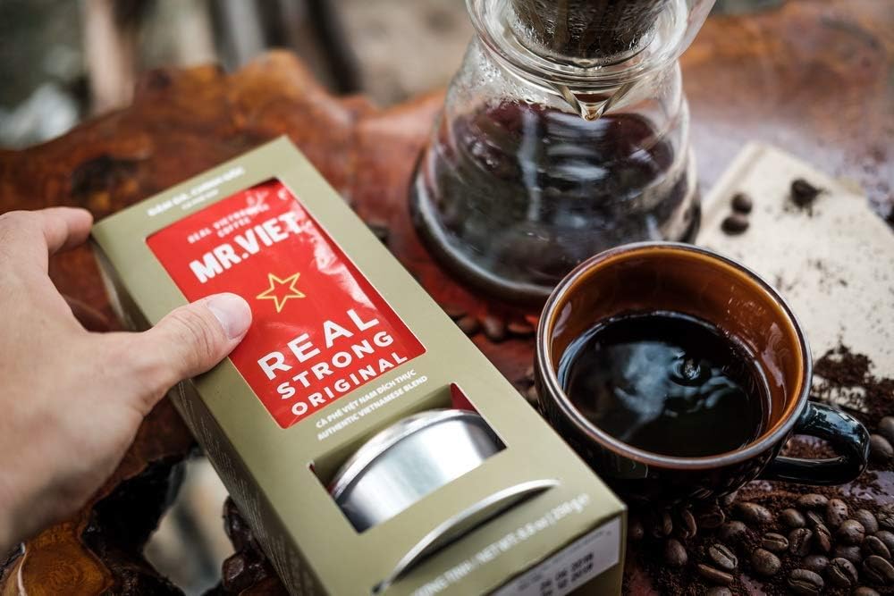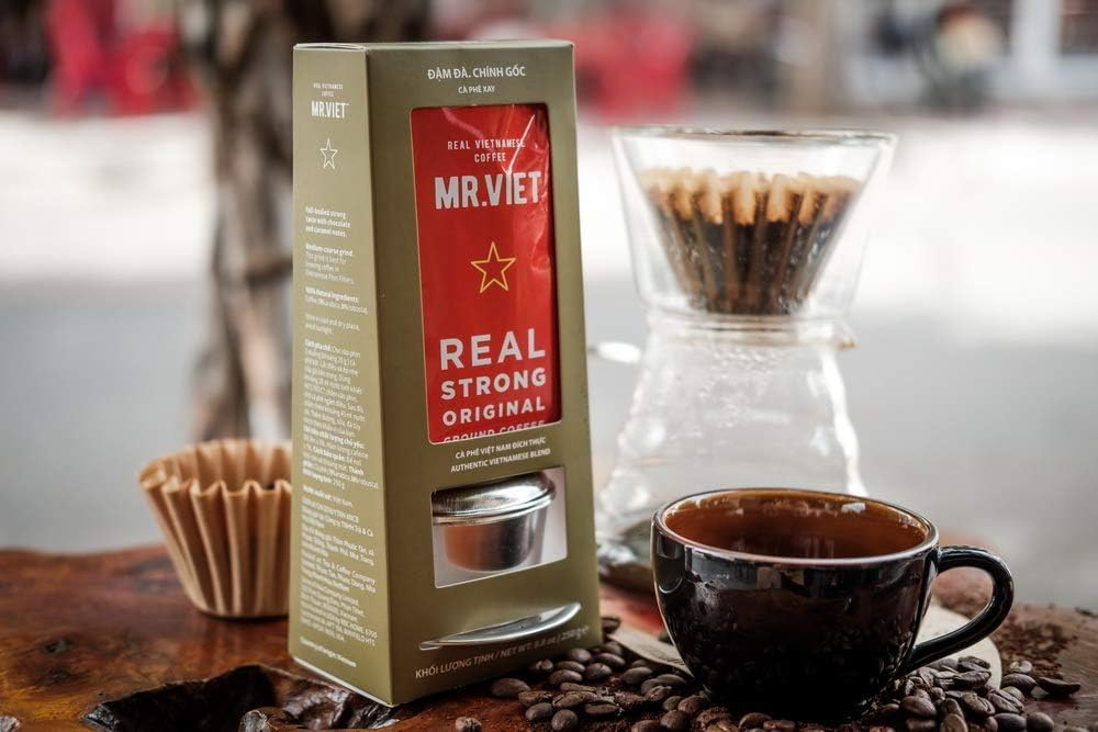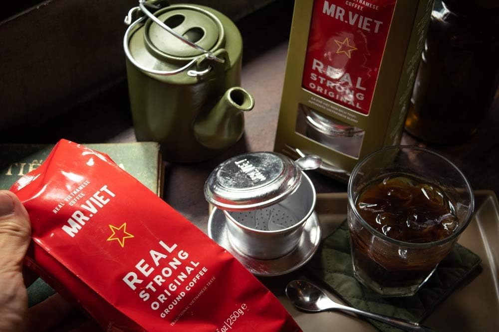 Mr.Viet Real Strong Star 研磨咖啡,搭配 phin 滤杯。传统浓郁的越南风味,巧克力和焦糖的芬芳扑鼻而来。搭配传统越南 phin 滤杯,带来正宗的滴滤咖啡体验。完美烘焙,咖啡爱好者将体验到越南咖啡的优质正宗风味。
