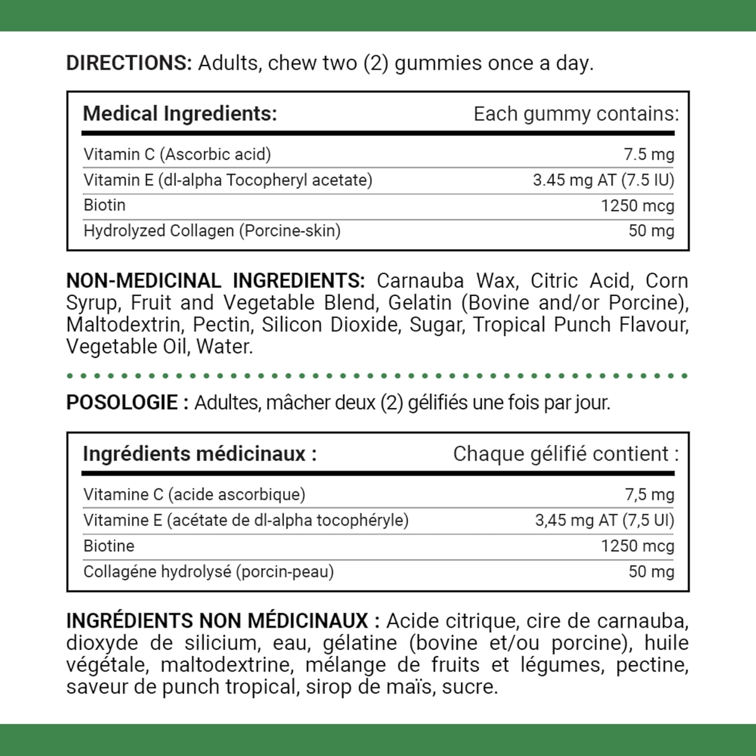 40多年来,NATURE'S BOUNTY 一直以您为中心,研发维生素和营养补充剂。您服用维生素是因为想帮助身体保持最佳状态——那么,何必只选择普通的维生素品牌呢?今天就来试试 NATURE'S BOUNTY 吧!NATURE'S BOUNTY 护发、护肤、护甲胶原蛋白软糖有助于维持头发和皮肤的健康,并支持指甲健康。它有助于骨骼、软骨、牙齿和牙龈的发育和维护,并促进结缔组织的形成。此外,它还有助于伤口愈合和免疫功能的维持。它提供的抗氧化剂有助于防止自由基对细胞造成的损伤,并有助于维护黏膜健康。这些热带风味的软糖易于服用,含有 7.5 毫克维生素 C、3.45 毫克维生素 E、1250 微克生物素和 50 毫克水解胶原蛋白。成人每日一次,每次咀嚼两 (2) 粒软糖。