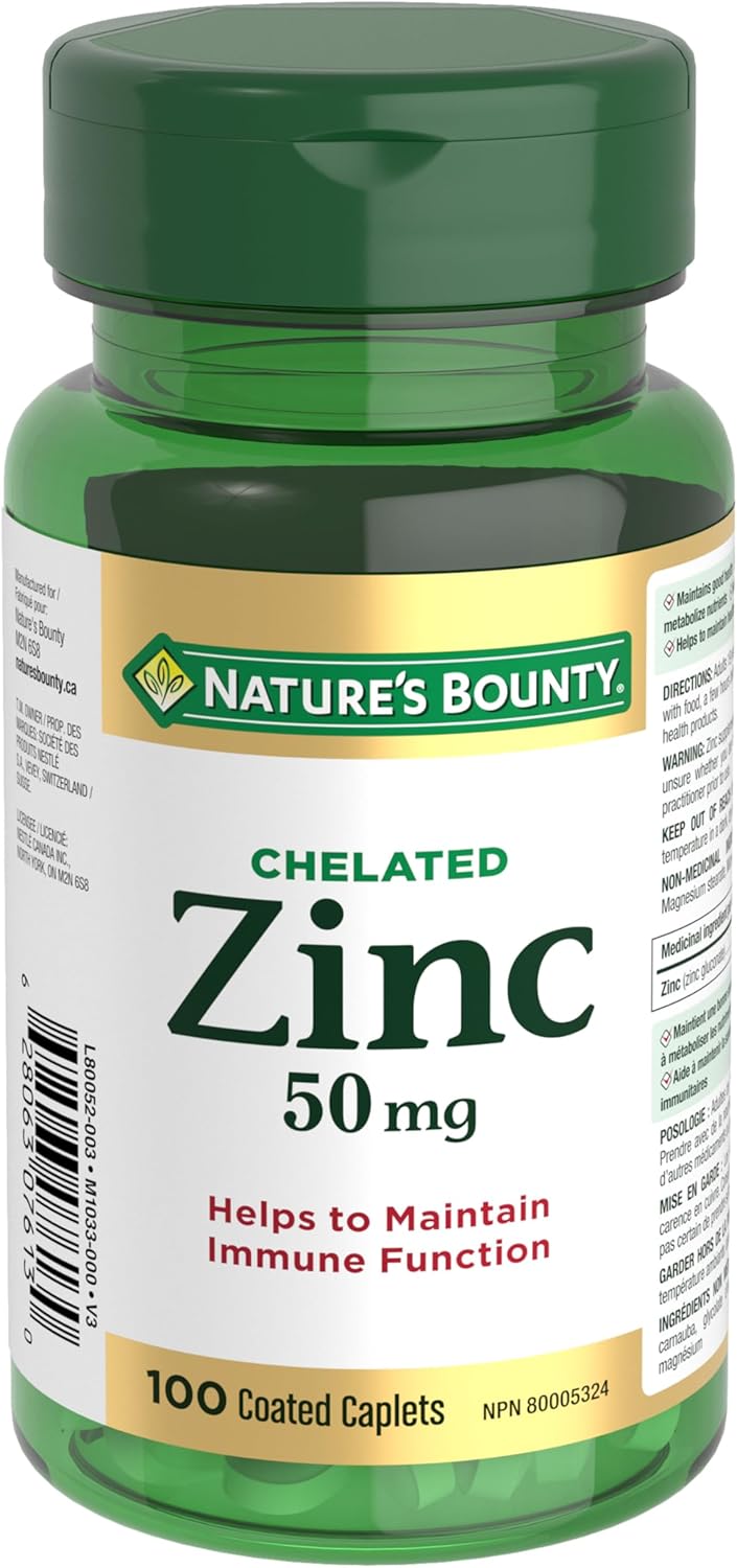 50 多年来,NATURE'S BOUNTY 一直致力于补充您身体自身的奇妙系统,为您提供饮食、睡眠、成长等所需的一切。无论您身在何处,我们都会与您一路同行。这是您的天性。今天就试试 NATURE'S BOUNTY 锌吧。Nature's Bounty 锌 50 毫克有助于维持免疫功能。它是维持身体健康的一个因素,也有助于保持健康的皮肤、代谢营养物质并促进结缔组织的形成。每片包衣胶囊含有 50 毫克葡萄糖酸锌,以及巴西棕榈蜡、羟丙甲纤维素硬脂酸镁、微晶纤维素和淀粉羟乙酸钠。19 岁及以上成人,每日服用一 (1) 片包衣胶囊。与食物一起服用,服用其他药物或天然保健品前或后几小时服用。