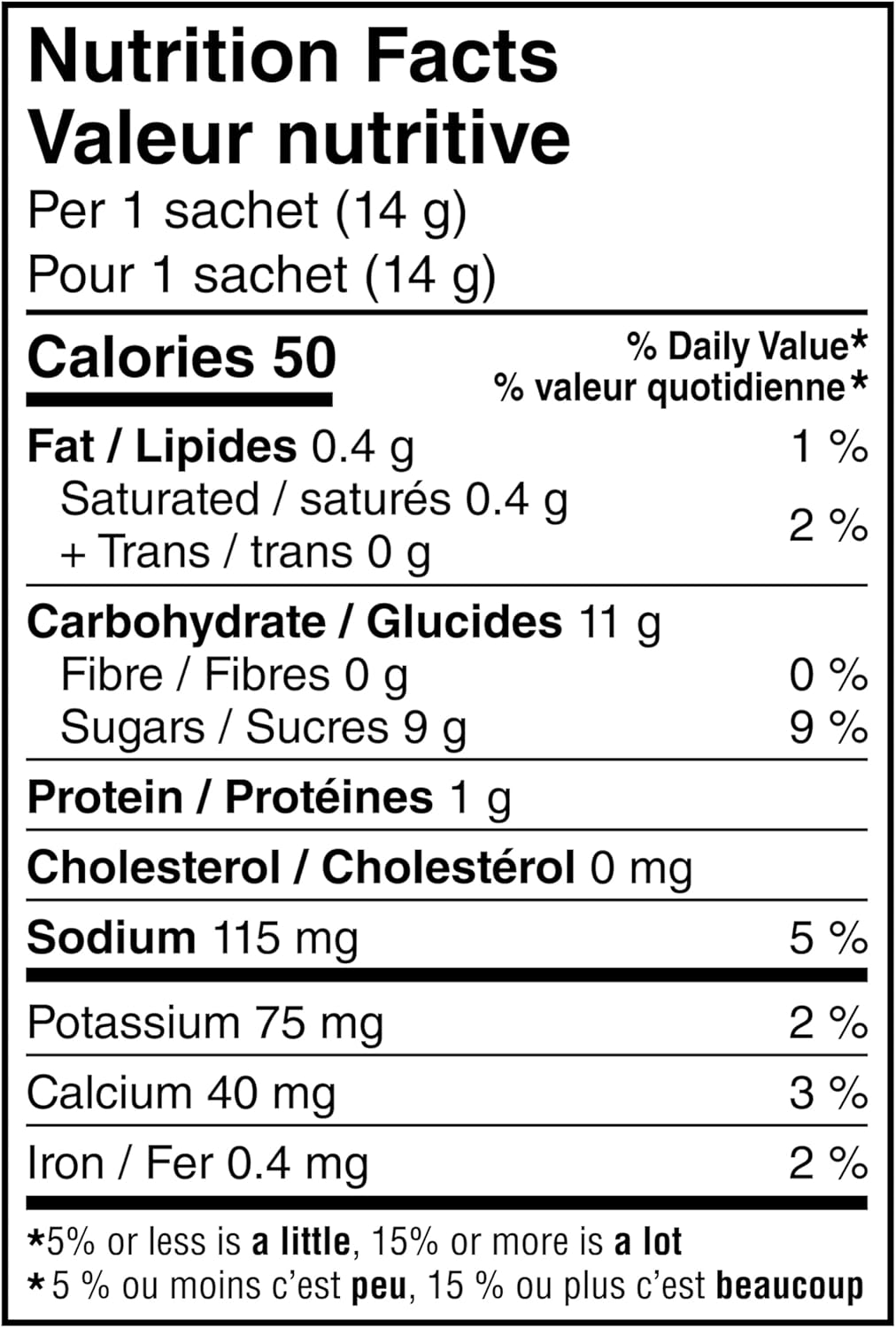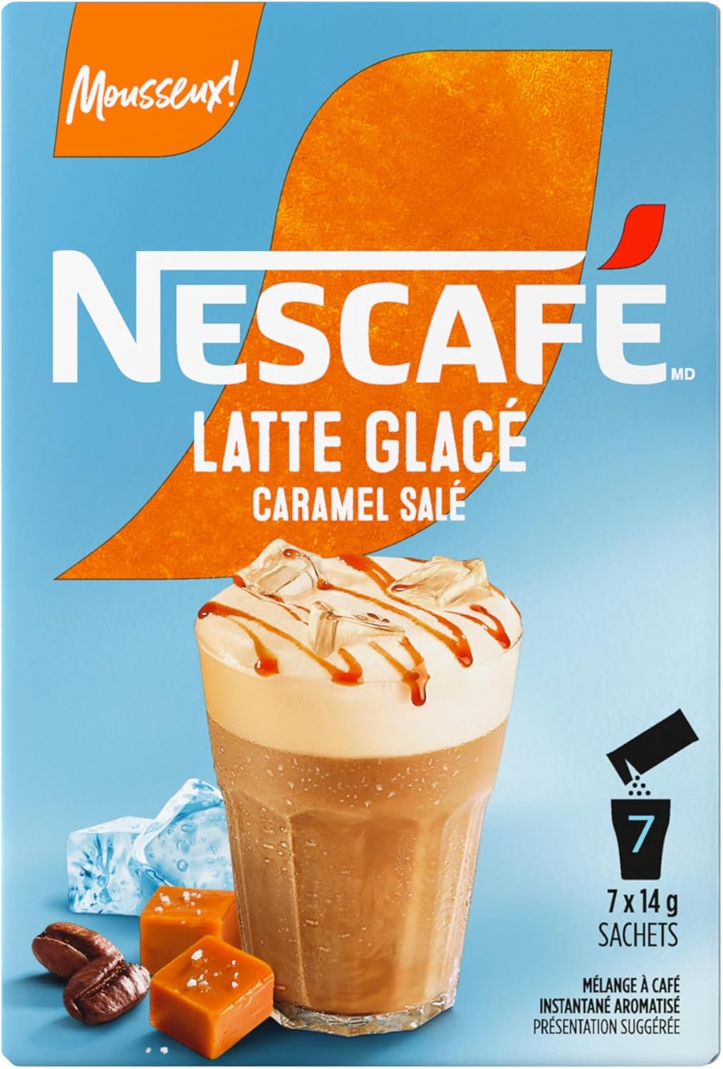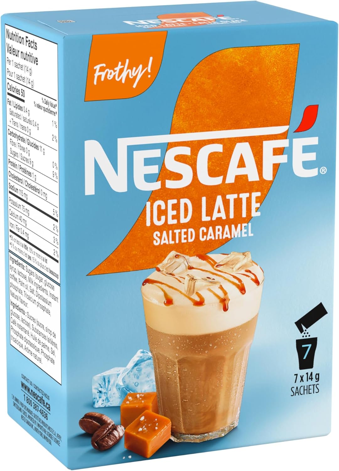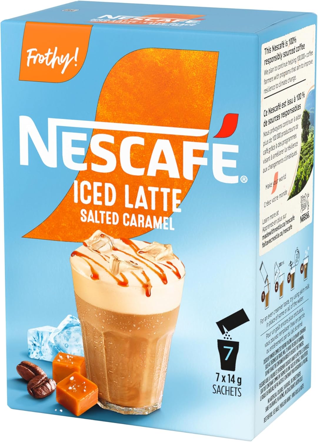 只需几步之遥,即可享受雀巢冰拿铁咸焦糖泡沫速溶咖啡粉中精选的高品质原料。这种新配方采用最优质的咖啡豆制成,让您在家中舒适地制作出泡沫丰富、咖啡馆品质的拿铁。只需添加冷水和冰块 - 无需咖啡师!每盒有 7 份,无论是在家中还是在旅途中,都可以用您最喜欢的杯子盛放一杯美味顺滑的冰咖啡,与大家分享。每份仅含 50 卡路里,这种美味的午后提神饮品是您每天啜饮时感觉良好的饮品。最好加冰块饮用,以获得冰凉、浓郁、提神的口感。雀巢冰拿铁咸焦糖泡沫速溶咖啡粉采用 100% 负责任采购的咖啡制成。雀巢计划继续通过旨在提高应对气候变化能力的项目帮助 100,000 多名咖啡农。