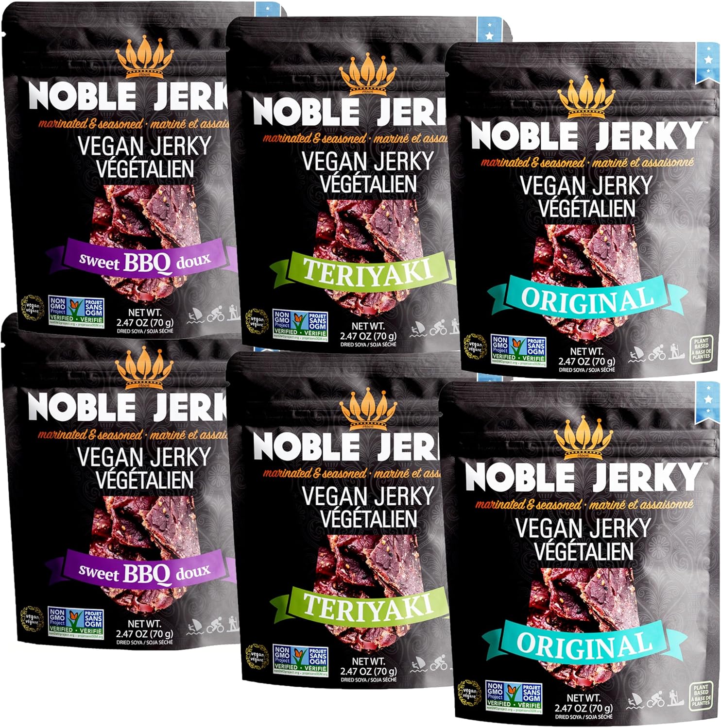 Noble Jerky 素食纯素零食 - 植物基,14 克植物蛋白零食 + 能量,非转基因,不含肉,非常适合办公室或午餐袋,多种口味 6 包(2 包烧烤味、2 包照烧味、2 包原味),70 克/包