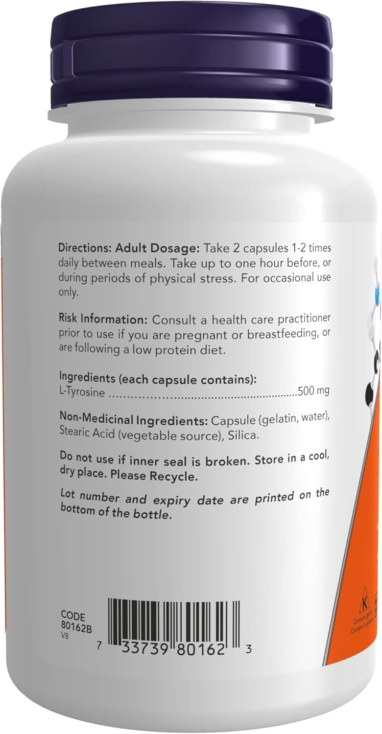 NOW L-酪氨酸(自由形态)胶囊,500毫克,120粒。L-酪氨酸是一种必需氨基酸,参与神经递质多巴胺、肾上腺素和去甲肾上腺素的生成,以及皮肤色素黑色素的形成。去甲肾上腺素和肾上腺素是人体应对急性应激的主要因素,它们与多巴胺一起,有助于维持积极情绪和精神警觉。此外,L-酪氨酸对甲状腺的正常功能尤为重要。NPN 80004769。NOW - 乙酰左旋肉碱 500毫克,100粒胶囊。乙酰左旋肉碱 (ALC) 是一种改性氨基酸,它通过协助脂肪运输到线粒体并在那里转化为ATP(细胞燃料)来支持细胞能量生成。 ALC 是一种生物利用度极高的左旋肉碱,可以穿过血脑屏障,有助于控制氧化损伤、支持线粒体功能并有助于维持正常的神经递质活性。