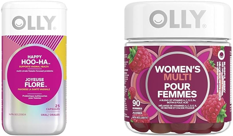 OLLY 补充剂胶囊,无麸质,多种菌株,女性专用益生菌补充剂,Happy HOO-HA 支持阴道健康,25 粒胶囊和女性多种软糖补充剂,45 天供应量,90 粒软糖