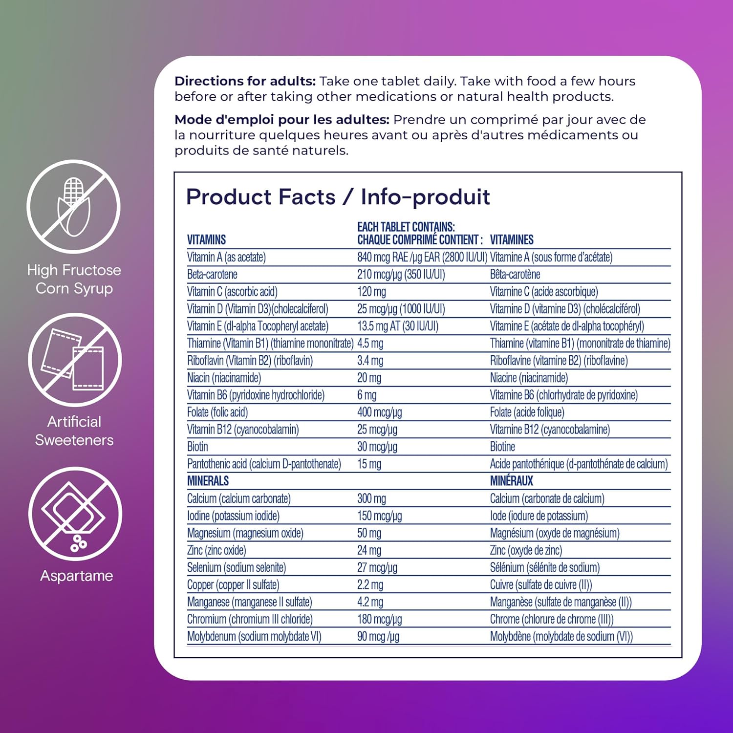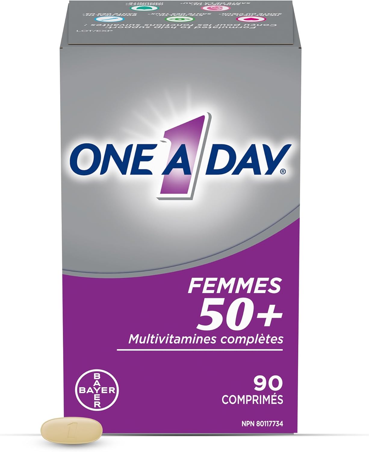 您不在乎年龄,您可以按照自己一贯的方式生活!使用 One A Day 50 岁以上女性复合维生素来支持您的营养,这是一种专为 50 岁以上女性配制的复合维生素,旨在支持衰老的主要问题。在我们经历这个我们称之为生命的奇妙旅程时,我们的营养需求自然会发生变化。One A Day 50 岁以上女性复合维生素含有多种必需维生素和矿物质,有助于支持:骨骼健康 - 帮助骨骼和牙齿的发育和维持免疫健康 - 帮助维持免疫功能健康的皮肤和头发 - 保持健康的头发、皮肤和指甲眼睛健康 - 帮助支持眼睛健康肌肉功能 - 帮助维持肌肉功能新陈代谢 - 帮助体内的能量代谢抗氧化剂以保持健康 - 抗氧化剂的来源,有助于维持身体健康心脏健康 - 有助于维持心肌功能您的身体可能需要必需的维生素,如 A、B6、B12 C、D 和 E;以及钙、镁和锌等矿物质;One A Day 50岁以上女性复合维生素补充剂,一片即可补充17种关键维生素和矿物质,满足每日推荐摄入量的100%。*服用One A Day 50岁以上女性复合维生素是帮助您展现最佳状态的另一种方式。每片都富含您所需的必需维生素和矿物质,有助于保持身体健康,同时不含高果糖玉米糖浆、阿斯巴甜和人工甜味剂。为什么不今天就将One A Day 50岁以上女性复合维生素纳入您的健康生活方式呢!*维生素和矿物质摄入量基于加拿大卫生部的每日推荐摄入量。成人服用方法:每日一片,随餐服用,在服用其他药物或天然保健品前或后几小时服用。为确保本产品适合您,请务必阅读并遵循标签上的说明。