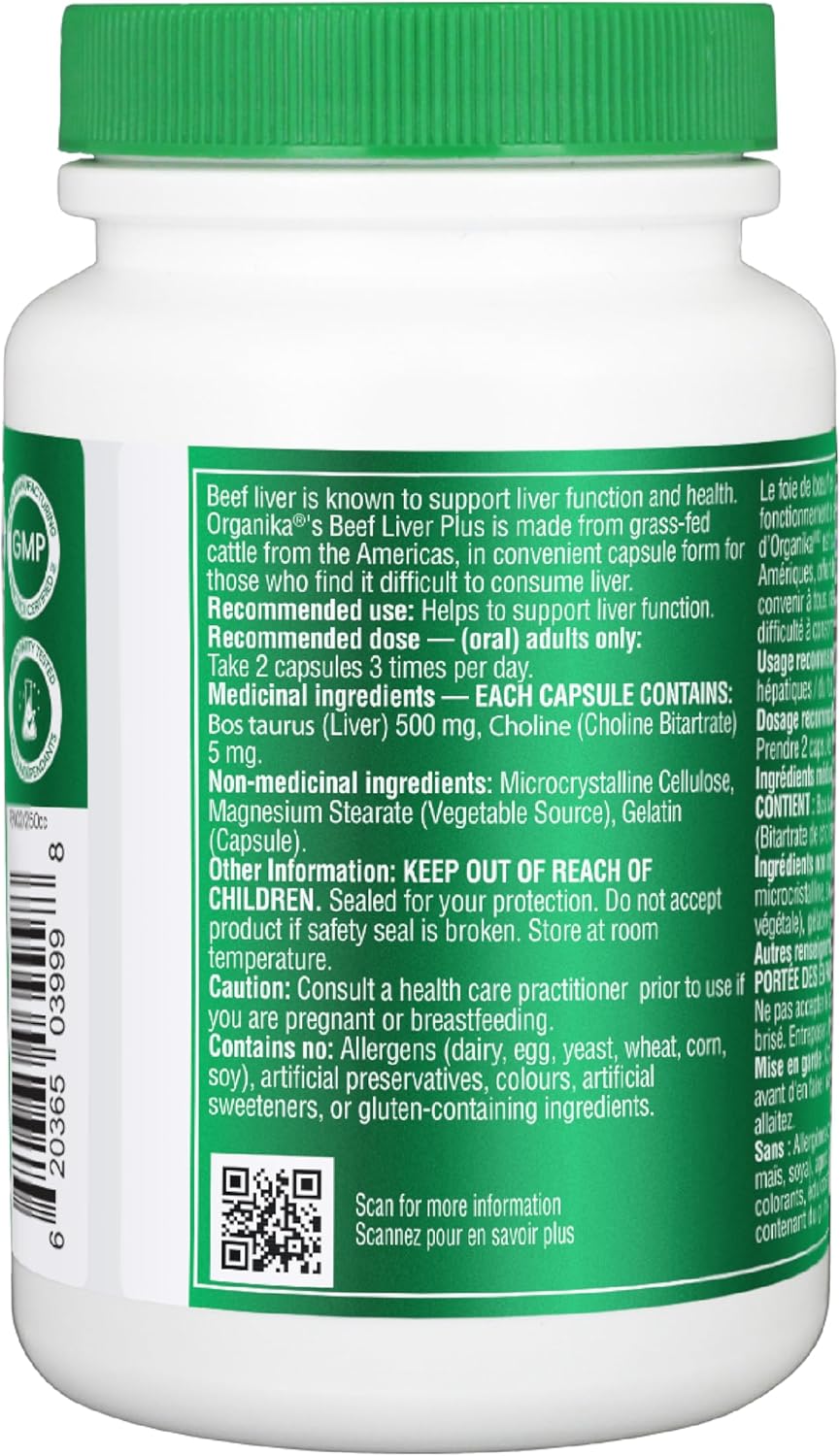 Organika 牛肝加胆碱 - 源自草饲牛和育肥牛,牧场饲养,富含维生素和矿物质,支持肝功能、能量水平和免疫力 - 90 粒胶囊