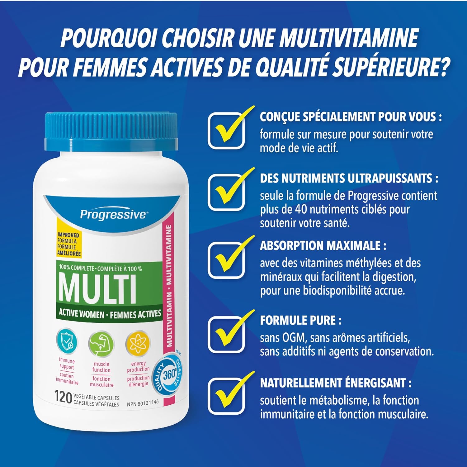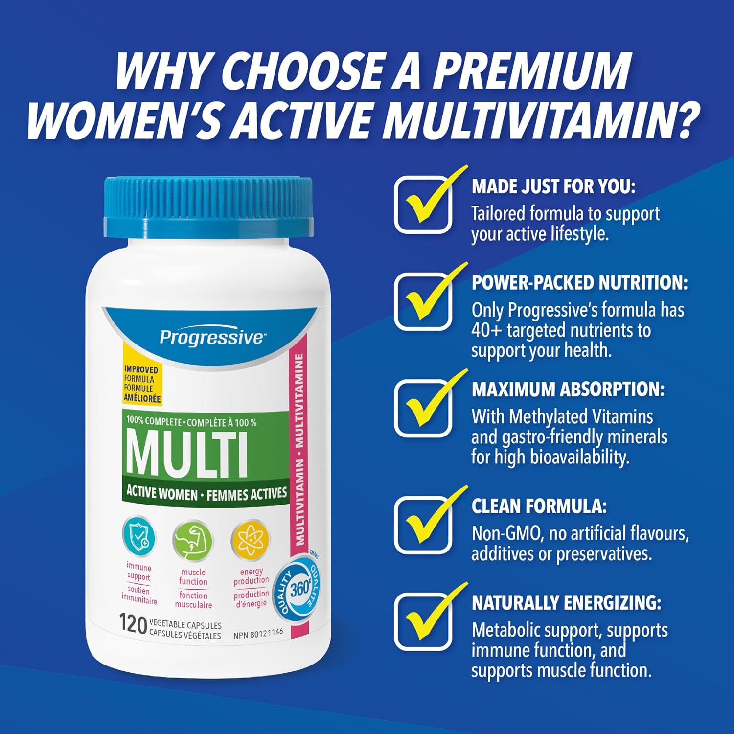 Progressive Advanced 每日复合维生素,专为活力女性设计,含DIM、圣洁莓、玛卡和南非醉茄。支持免疫健康、平衡雌激素和能量,100% 完整配方,加拿大制造,120 粒装