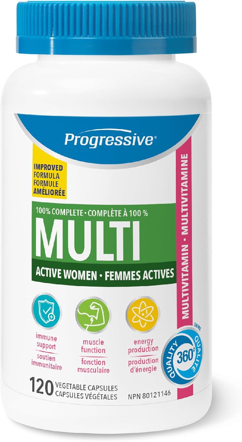 Progressive 100% 活力女性全效复合维生素专为忙碌的女性设计。无论您是定期锻炼、长时间工作、养家糊口,还是以上任何一种情况,您的身体都需要活力复合维生素配方的支持。这款改良配方富含多种营养成分,旨在满足女性的健康需求,包括促进健康的雌激素平衡。这些营养成分包括槲皮素、DIM、圣洁莓、玛卡、南非醉茄和西伯利亚人参。