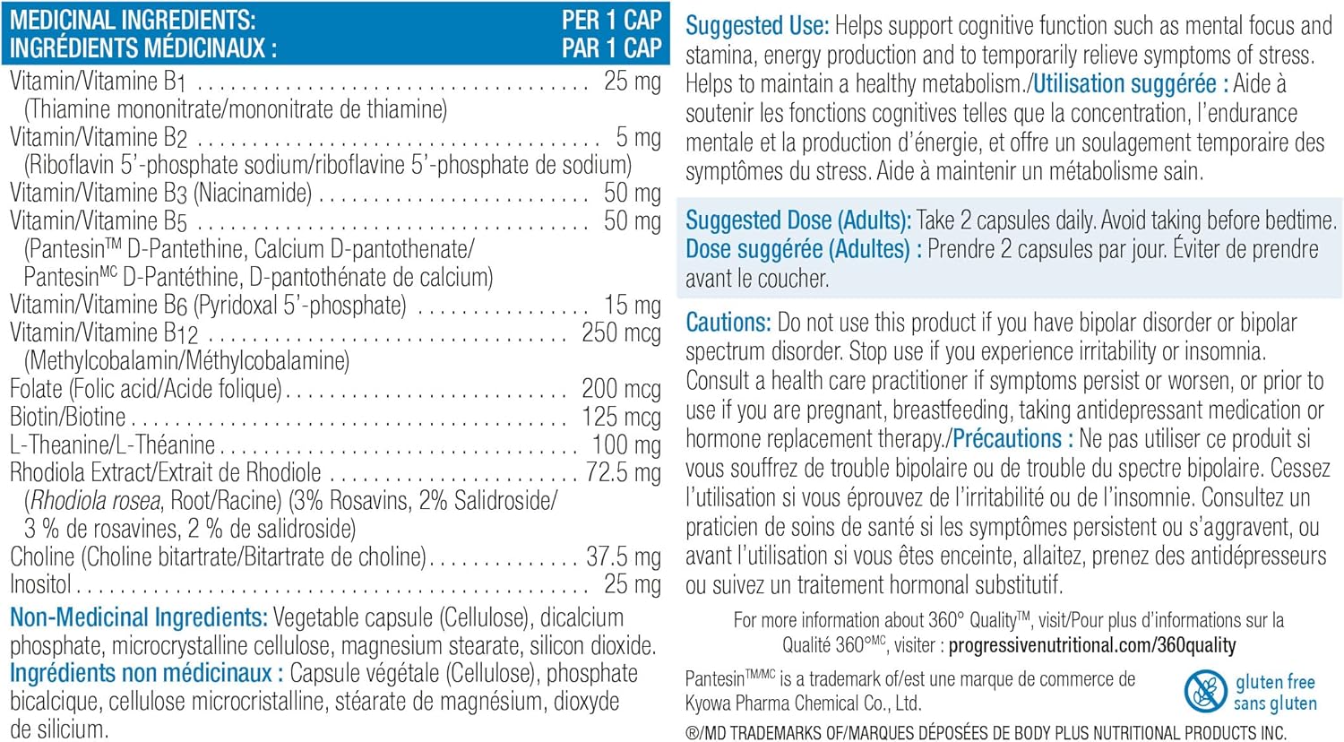 渐进式维生素 B 复合物是一种全谱 B 复合物,含有治疗剂量的认知和压力支持成分:红景天根和 L-茶氨酸。