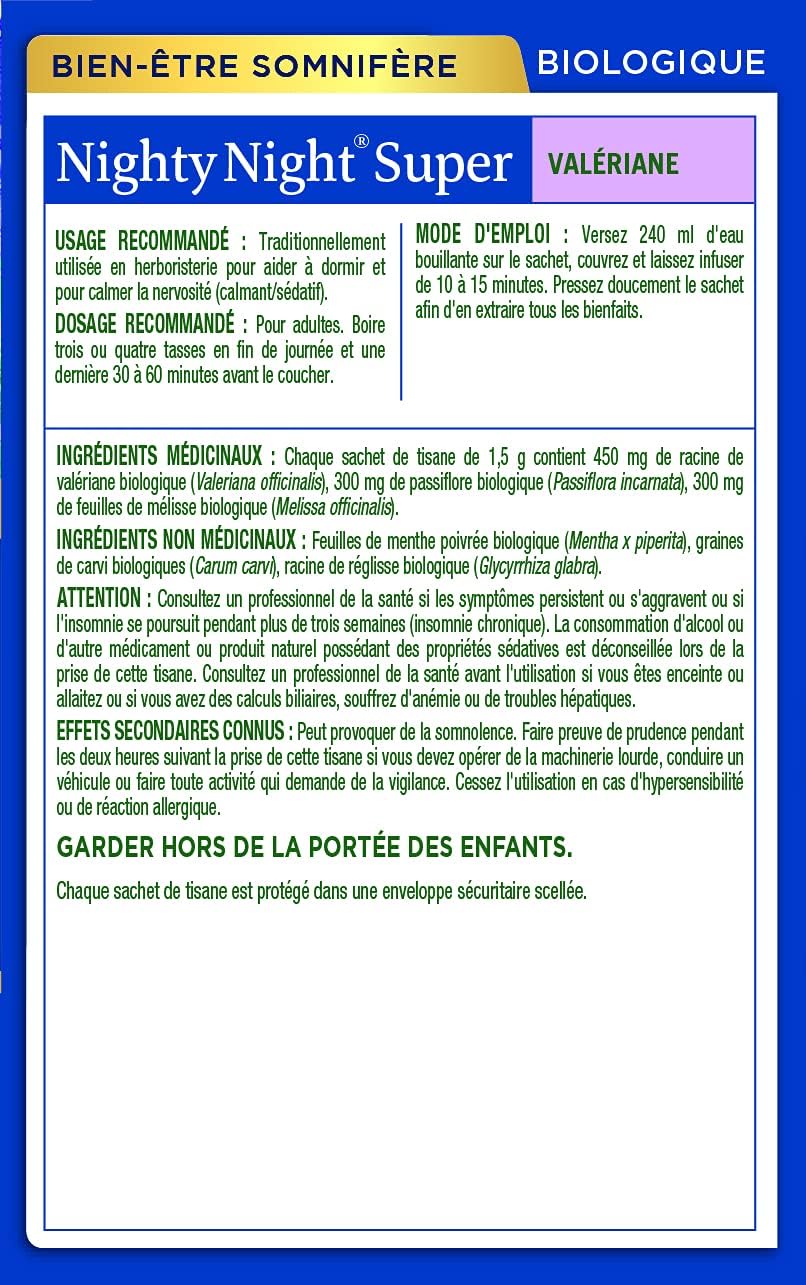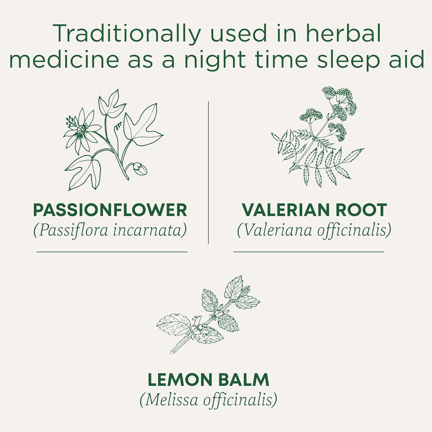 夜间助眠。有机、犹太洁食认证,B-Corp 认证。NPN 80040643。来自道德贸易伙伴的始终如一的高品质草药。草药师配方茶。无塑料可堆肥茶包。6个装,96个茶包。