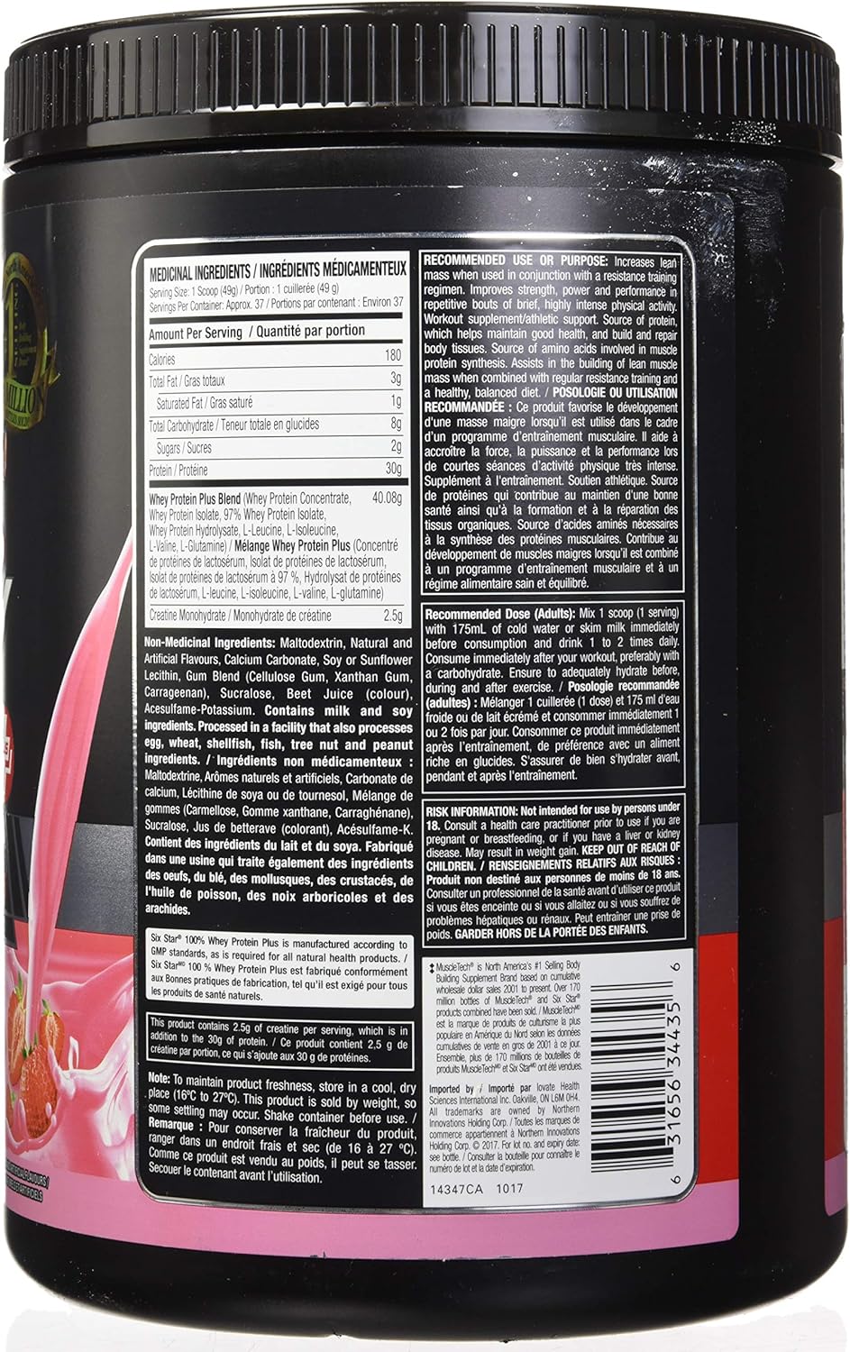 乳清蛋白粉+肌酸一水化合物,Six Star 100% 乳清蛋白增强版,乳清分离蛋白和肽,增肌瘦蛋白粉,乳清分离蛋白奶昔,草莓味,4 磅。Six Star 100% 乳清蛋白增强版是帮助恢复和补充训练能量的明智之选。100% 乳清蛋白增强版富含经科学研究的关键成分,包括乳清分离蛋白和肌酸,可增强肌肉和力量,其科学性能优于普通蛋白质。Six Star 乳清蛋白增强版富含优质支链氨基酸、谷氨酰胺和肌酸,提供您所需的美味优质蛋白质配方,适合任何积极的生活方式。相信这些专业人士的信任,今天就购买 Six Star 100% 乳清蛋白加强版。锻炼前,Six Star 锻炼前爆发力,男女适用锻炼前粉末,含一水肌酸和 β-丙氨酸,可提供能量、专注力和强度,能量粉,水果混合味(30 份)释放您最好的锻炼强健的体魄是高强度、专注锻炼的结果,要达到这一点,您需要高能量水平来为有效的锻炼做好准备。Six Star 锻炼前爆发力精确地添加了精氨酸 AKG、β-丙氨酸、肌酸和咖啡因,以激发最佳表现。β-丙氨酸是一种众所周知的锻炼前成分,可提高肌肉肌肽水平,从而缓冲乳酸,让您训练更长时间。精氨酸是一种氨基酸,也是一种很好的血管扩张剂,这意味着它可以改善您的血液流动并使您的泵血更具爆发力。咖啡因刺激您的神经系统,提高能量和警觉性,而肌酸是增加力量的补充成分。极致能量。强大的肌肉泵六星锻炼前爆发力来自美国排名第一的健身补剂品牌 Muscletech 的制造商,为您无与伦比的表现奠定了基础,帮助您突破平台期并测试您的极限。这种优质、美味的粉末由世界领先的研究人员配制而成,可提供令人难以置信的能量提升、增强的精神集中力和令人皮肤撕裂的肌肉泵,让您体验从未体验过的爆发性锻炼。六星锻炼前爆发力的惊人好处:能量补充体验前所未有的强度。通过科学研究的咖啡因剂量,获得主宰比赛所需的能量和注意力。锻炼感受令人皮肤撕裂的肌肉泵的力量,同时通过关键剂量的精氨酸 AKG 和肌酸来锻炼您需要的肌肉和力量。表现 主宰您的运动。使用临床剂量的 β-丙氨酸和牛磺酸来支持肌肉耐力。经临床验证的成分可促进肌肉生长 Six Star Pre-Workout Explosion 提供经临床研究最多的肌酸形式,可增强肌肉块头、力量和表现。一项针对 31 名进行重量训练的测试对象(随机分配到 3 个组中的 1 个)的研究中,服用相同形式肌酸的受试者在短短 10 天内就显著提高了卧推强度,与基线相比提高了 18.6%(6,658 焦耳 vs. 5,613 焦耳)。Six Star Pre-Workout Explosion 的剂量精确,两勺中含有 3 克 β-丙氨酸、3 克肌酸和 2.2 克精氨酸 AKG。这款优质的运动前补充剂是您提升耐力和增强力量的强大助力。强劲的肌肉泵感源自高级泵感复合物,该复合物由牛磺酸、L-瓜氨酸、L-瓜氨酸苹果酸盐和L-精氨酸盐酸盐等强效成分独特组合而成。