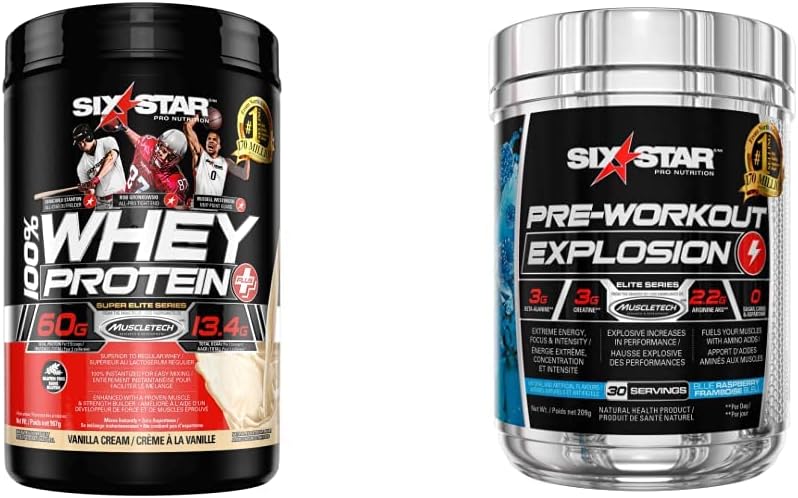 乳清蛋白粉+肌酸一水化合物,Six Star 100% 乳清蛋白增强版,乳清分离蛋白和肽,增肌瘦蛋白粉,乳清分离蛋白奶昔,香草味,2 磅。最佳运动后蛋白质补充:运动时,您的身体需要更多蛋白质来帮助肌肉恢复和发育。Six Star 100% 乳清蛋白增强版为您的身体提供大剂量快速吸收的乳清蛋白,以满足这一需求。蛋白质消化后会分解成氨基酸(肌肉的组成部分),进而修复肌肉组织并促进生长。Six Star 100% 乳清蛋白增强版还添加了肌酸,这是一种经科学验证的增肌和力量增强剂。肌酸促进身体能量储备的补充,从而进一步加速肌肉恢复。Six Star Preworkout Explosion 男女通用运动前粉,含一水肌酸和β-丙氨酸,可提升能量、专注力和强度,能量粉,蓝莓味(30 份)释放你的最佳锻炼状态强健的体魄是高强度、专注锻炼的结果,要达到这个目标,你需要高能量水平来为高效的训练做好准备。Six Star Pre-Workout Explosion 精确配比了精氨酸 AKG、β-丙氨酸、肌酸和咖啡因,可激发最佳表现。β-丙氨酸是一种众所周知的运动前成分,可提高肌肉中的肌肽水平,从而缓冲乳酸,让你可以训练更长时间。精氨酸是一种氨基酸,也是一种很好的血管扩张剂,这意味着它可以改善你的血液流动,让你的肌肉泵更有爆发力。咖啡因刺激你的神经系统,提高能量和警觉性,而肌酸是一种补充成分,可以提高力量。极致能量。强大的肌肉泵六星锻炼前爆炸剂由美国排名第一的健身补剂品牌 Muscletech 的制造商生产,为无与伦比的表现奠定了基础,帮助你突破平台期,测试你的极限。这种优质、美味的粉末由世界领先的研究人员配制而成,可提供令人难以置信的能量提升、增强的精神集中力和令人皮肤开裂的肌肉泵,让你体验到从未体验过的爆发力锻炼。六星锻炼前爆炸剂的惊人好处:活力体验前所未有的强度。通过科学研究的咖啡因剂量,获得主宰比赛所需的能量和注意力。增强 感受肌肉泵的强劲力量,同时通过关键剂量的 AKG 精氨酸和肌酸来增强您所需的肌肉和力量。 表现 主宰您的运动。使用临床剂量的 β-丙氨酸和牛磺酸来支持肌肉耐力。 经临床验证的成分可促进肌肉生长 Six Star Pre-Workout Explosion 提供经临床研究最多的肌酸形式,可增加肌肉块头、力量和表现。在一项针对 31 名接受过重量训练的测试对象(随机分配到 3 个组中的 1 个)的研究中,在短短 10 天内,服用 Six Star Pre-Workout Explosion 中相同形式肌酸的测试对象在卧推时的力量能力显著提高了 18.6%(6,658 焦耳 vs. 5,613 焦耳)。 Six Star Pre-Workout Explosion 两勺精准配方,含 3 克 β-丙氨酸、3 克肌酸和 2.2 克精氨酸 AKG。这款优质运动前补充剂是您提升耐力和力量的强大助力。强劲的肌肉泵感源自 Advanced Pump Complex,它独特地融合了牛磺酸、L-瓜氨酸、L-瓜氨酸苹果酸盐和 L-精氨酸盐酸盐等强效成分。