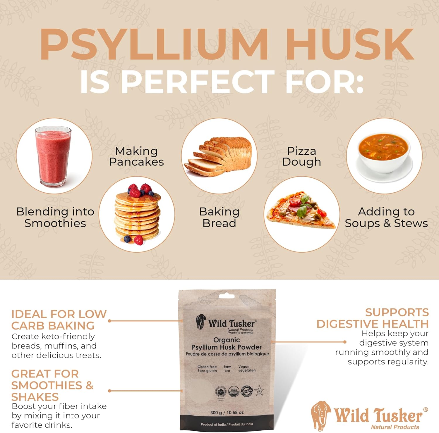 Wild Tusker 有机洋车前子壳粉 - 100% 有机,酮类友好,无麸质,300 克