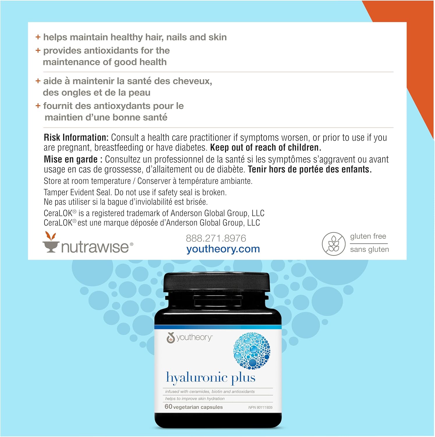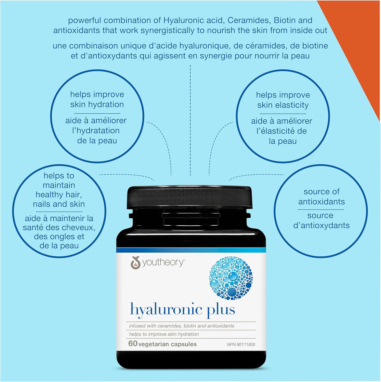 Youtheory 透明质酸加素食胶囊,60 粒,含神经酰胺、生物素和维生素 C。有助于改善皮肤保湿。