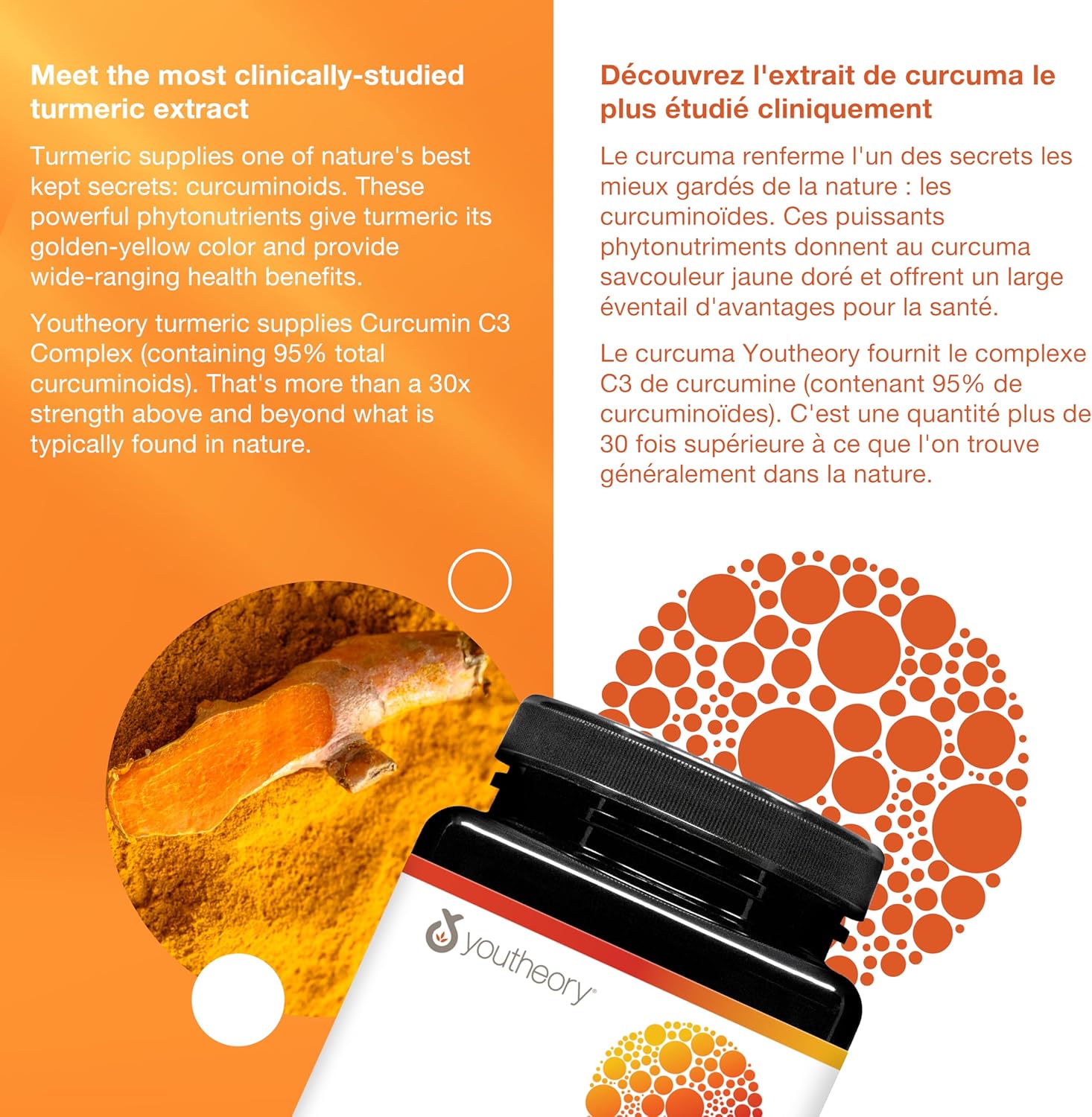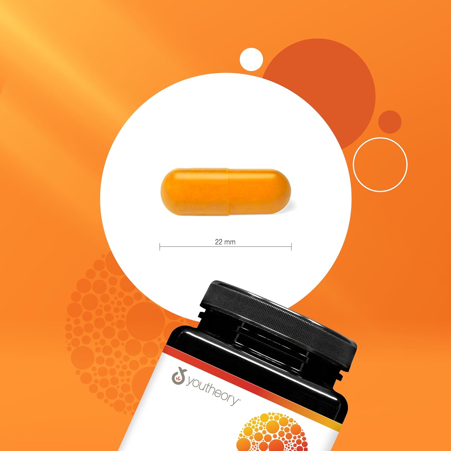 youtheory 姜黄超强配方含有 500 毫克经过临床研究证实的姜黄提取物(总姜黄素含量为 95%),并添加黑胡椒以促进吸收和生物利用度。