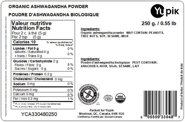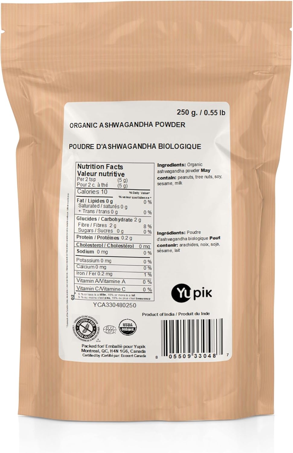Yupik 有机南非醉茄粉 250 克,经美国农业部认证,非转基因,纯素,无麸质,超级食品补充剂,富含纤维,无脂肪,非常适合用于镇静茶和饮料