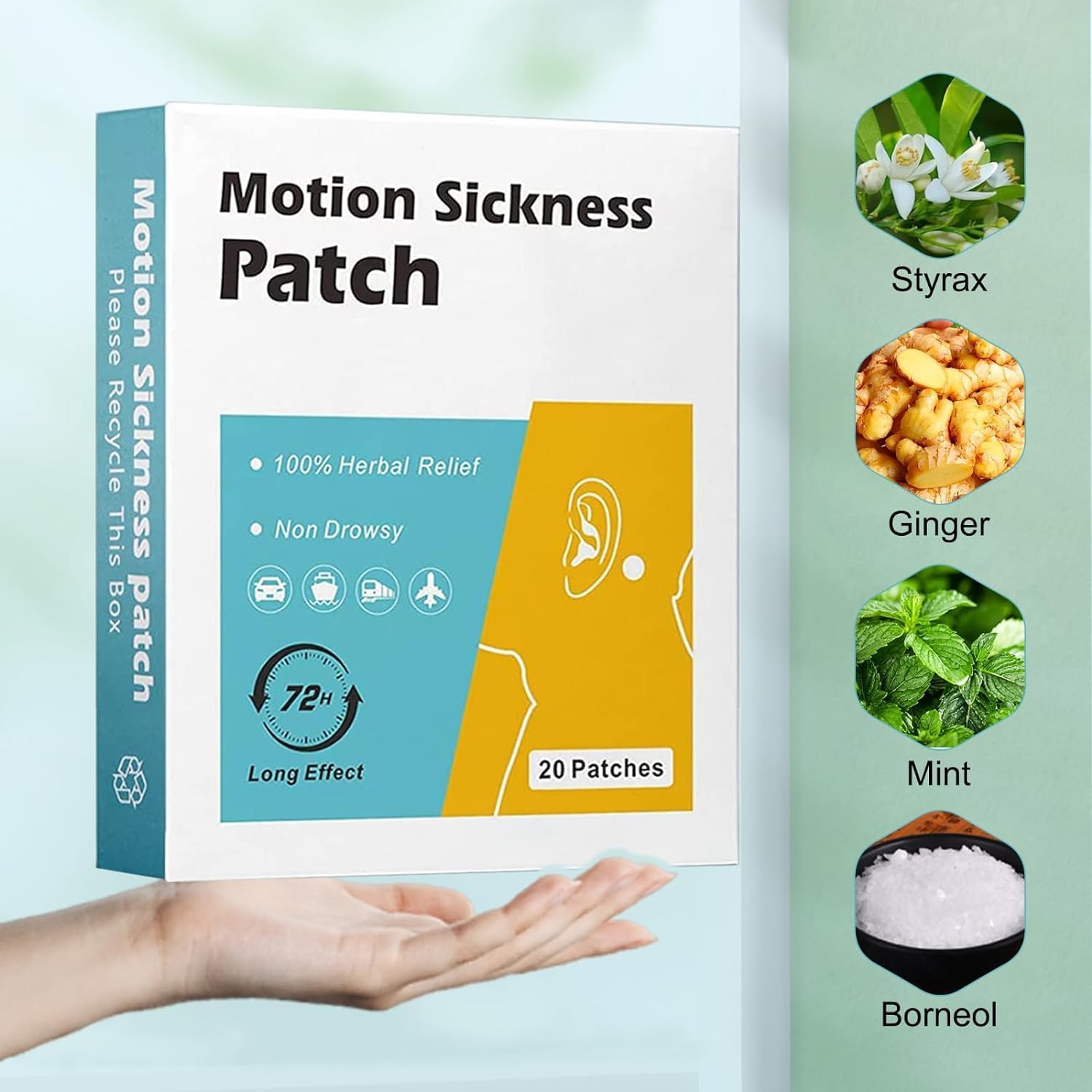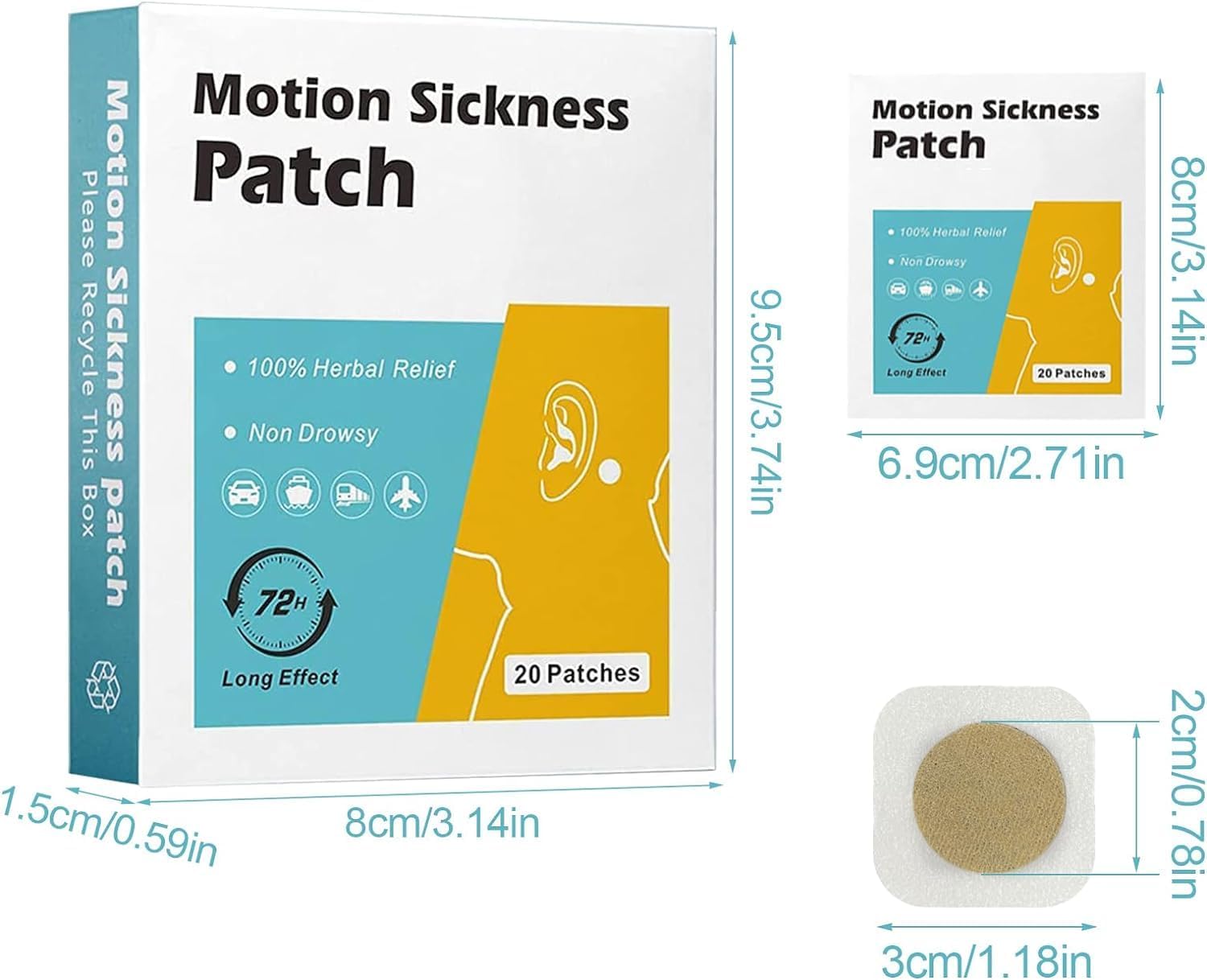 【有效緩解嘔吐】暈船貼可緩解因搭乘汽車、船、飛機、火車等交通工具引起的嘔吐、噁心、頭暈、厭食等症狀。 【安全有效】100% 天然草本,不含任何藥物或副作用!本草本配方安全有效,適用於男性、女性、青少年及四歲以上兒童,有效緩解暈動病。本產品可完全緩解暈動病症狀,且無藥片和其他藥物的副作用。 【快速起效,持久有效】出遊前 10 分鐘貼上,暈船貼有效期限約 1-3 天。如果暈車嚴重,可以同時在耳後和肚臍上使用該貼片。 【使用簡單】從棕褐色圓形貼片上取下白色塑膠背襯,將黏合面貼在肚臍或耳垂後面乾燥無毛的皮膚區域,每隻耳朵後面貼一個暈車貼片。 【攜帶方便】我們小巧輕便的包裝經過特別設計,非常方便旅行。