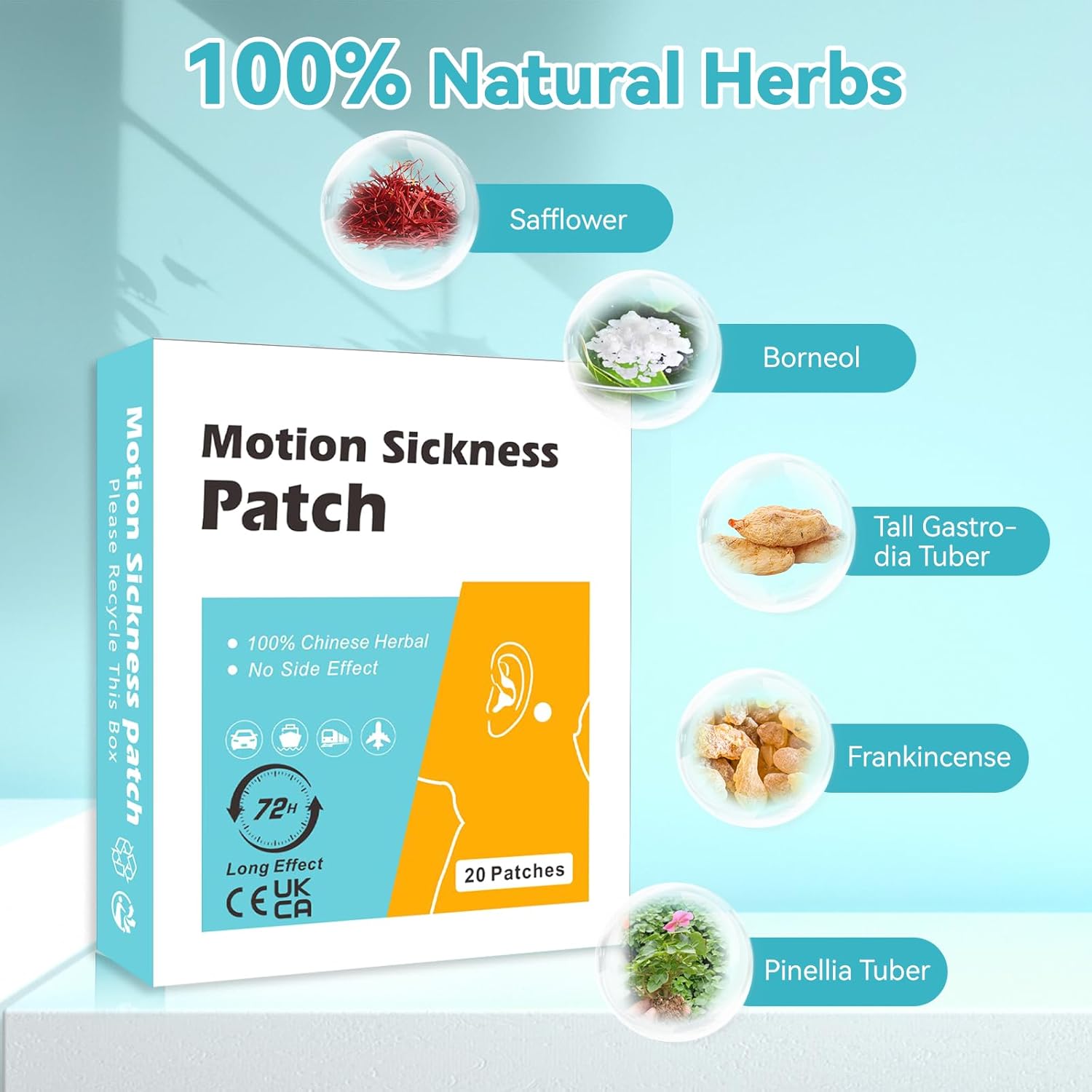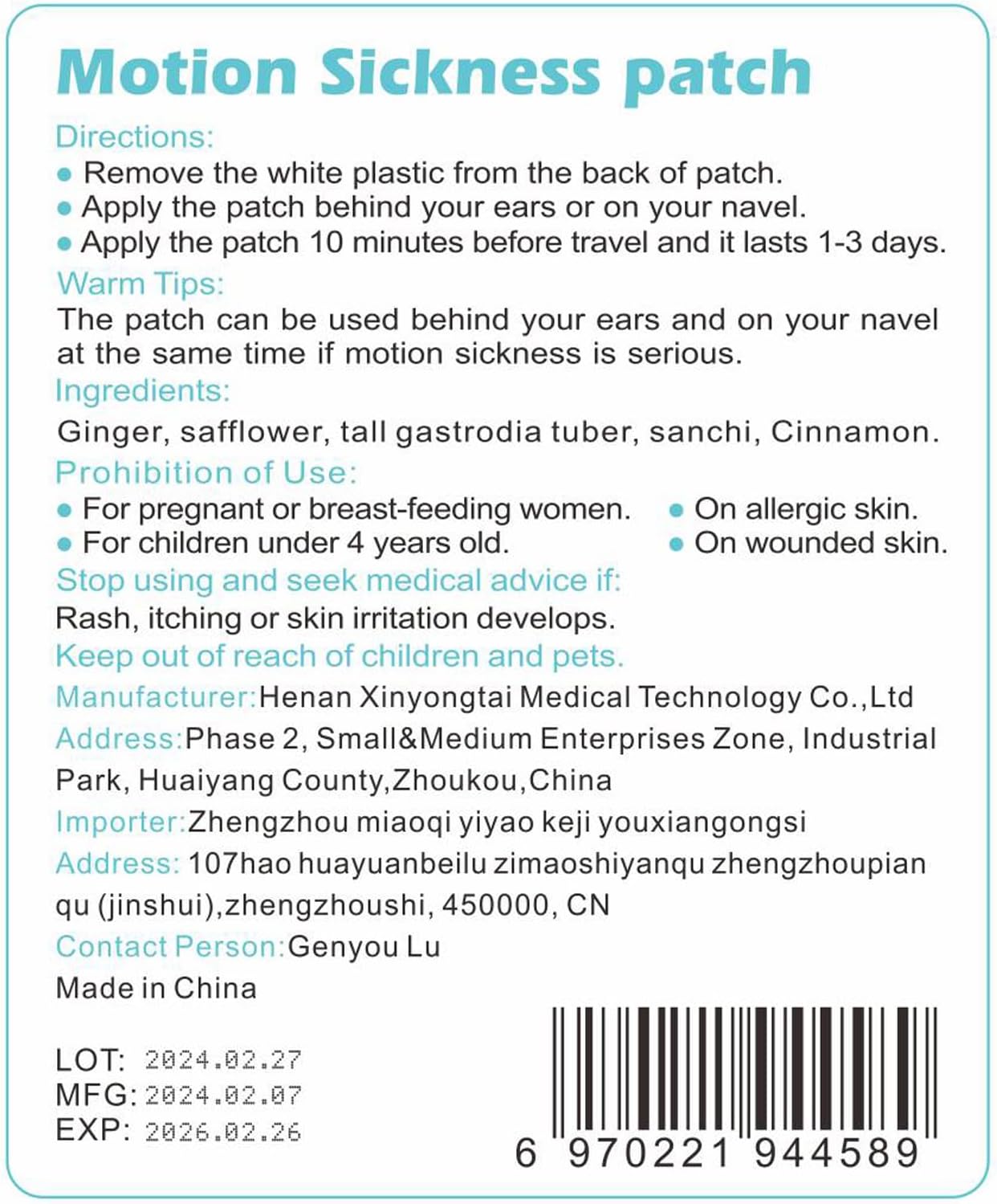 請注意 100%天然草本療法對 4 歲及以上兒童安全;孕婦和手術後身體不得使用。 注意 貼片不能接觸水。 旅行前貼在耳後 10 分鐘,效果可持續 1-3 天 小巧輕便的包裝,是最佳旅伴。 使用方法 1.撕開保護層,將黏合層貼到肚臍或耳後。 2.根據您的身體狀況,每次使用一到兩片貼片,無痛去除。 3.旅行前 10 分鐘貼上,效果可持續約 1-3 天。 警告: 1.孕婦、哺乳期婦女及 4 歲以下兒童不得使用。 2.避免在過敏和破損的皮膚上使用。 3.不建議手術後身體使用。 包裝:2 片/袋,10 袋/盒。