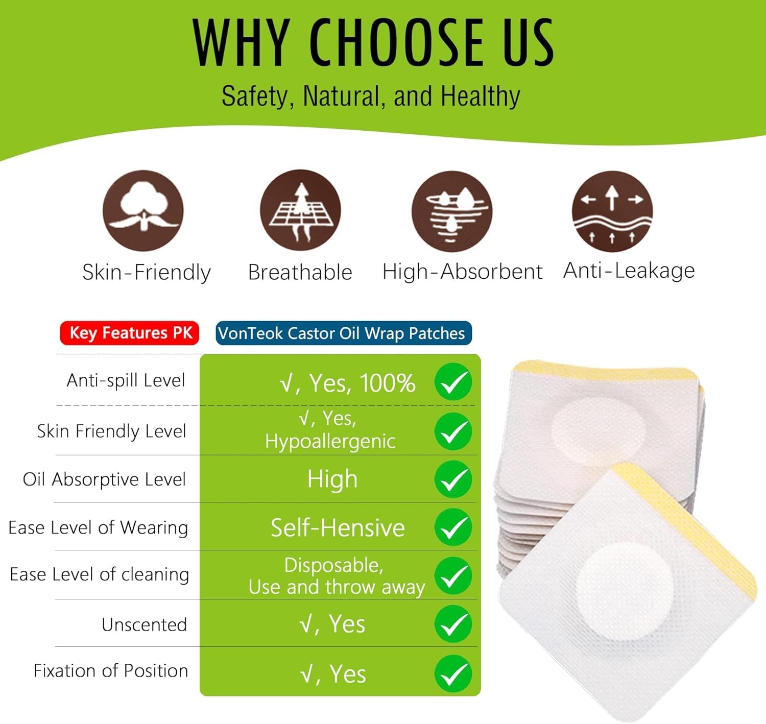 使用方法與好處:取出蓖麻油肚臍貼,撕下離型紙,加入幾湯匙蓖麻油,然後將蓖麻油肚臍貼放在肚臍頂部。在肚臍處使用蓖麻油可有效促進消化,緩解腹部炎症,並可為您的免疫系統提供幫助!材料與優點:有機蓖麻油包肚臍貼由有機棉製成,蓖麻油包肚臍貼具有獨特的緻密純天然棉芯層,防溢框架和 PU 防水層鎖油避免浸漬,與傳統可重複使用的蓖麻油包相比,我們的蓖麻油包肚臍斑點臍帶貼是一次性使用的,更清潔,更安全,並且可以在使用後隨時更換。易於運輸:無論您是旅遊還是徒步旅行,我們的蓖麻油包包裹肚臍貼都易於包裝,尺寸僅為 2.75 英寸 * 2.75 英寸太佔地方了!最佳禮物:無論是送給父母、朋友或愛人,我們的蓖麻油包都是送給您生命中那個特別的人的完美禮物。它一定能為他們提供舒適感,並滿足他們的各種需求。高品質售後服務:如果您對我們的產品有任何疑問,請隨時與我們,我們24小時為您服務。