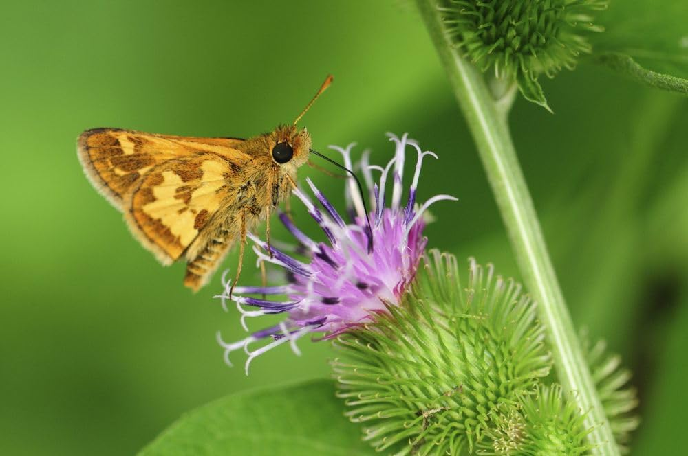 一隻小斑蝶Polites peckius正在為薊花授粉。馬薩諸塞州阿靈頓。海報印刷,達琳·穆拉夫斯基(Darlyne Murawski)作品(17 x 11)