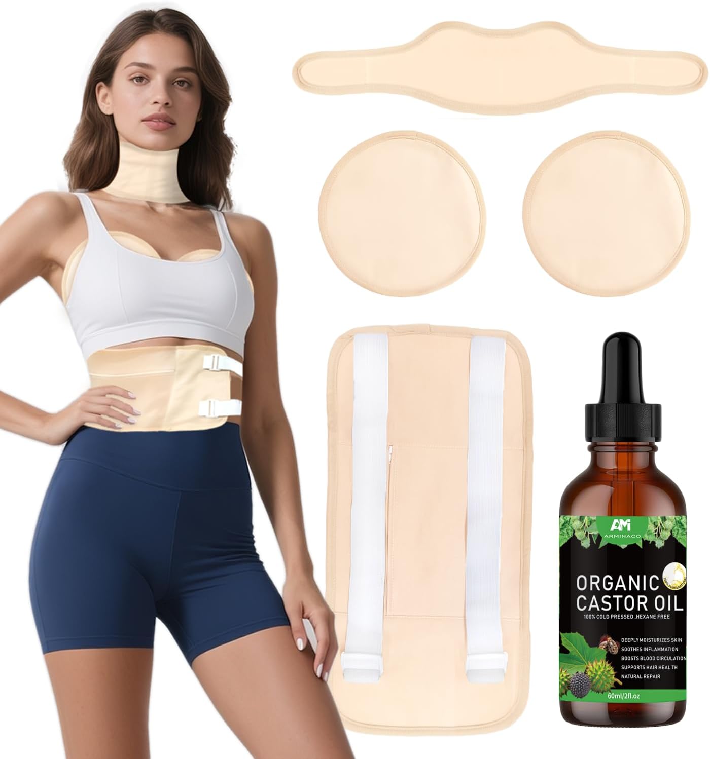 🧰【全效合一天然排毒入門套裝】包含4個符合人體工學的護墊(肝臟、2個胸部、1個頸部)和60毫升冷壓有機蓖麻油。專為女性和初學者精心挑選——沒有令人困惑的附加組件,只包含輕鬆開啟蓖麻油療法程序的必需品。 🔒【MAGICSEAL 可調式貼合 - 不漏水,不髒亂】靈活的綁帶貼合您的身體,不會產生任何壓力點。即使活動、睡覺或伸展身體,也不會滑落或留下污漬。防漏三層技術優於過時的法蘭絨和扣環設計。 🌱【純有機油 - 精心裝瓶】冷壓,不含己烷,並在 GMP 認證的工廠裝瓶。每批產品均經過第三方毒素檢測-不含對羥基苯甲酸酯和殺蟲劑,只採用清潔、療效級的蓖麻油,值得信賴,呵護您的肌膚。 🎯【輕鬆三步,適合忙碌人士】用滴管塗抹油,固定繃帶,放鬆身心,煥活肌膚。專為初次使用者、忙碌的媽媽和追求整體健康的人士設計。我們的逐步指南確保每次使用都安全有效。 💖【針對性緩解核心問題】緩解經期不適、腹脹、頸部緊張和荷爾蒙平衡。繃帶貼合每個區域,帶來最大舒適度和療效。 (注意:孕期不建議使用-如不確定,請諮詢醫生。)