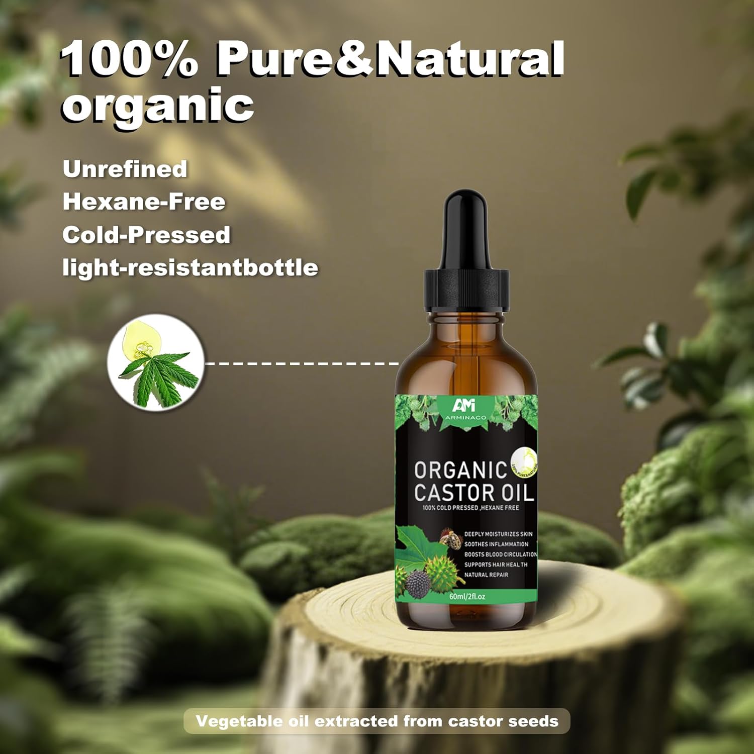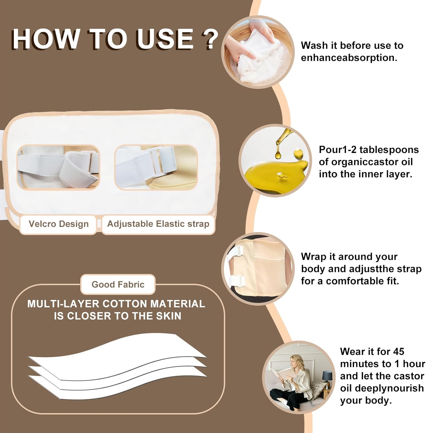 ARMINACO 蓖麻油套裝,適合女性和初學者 - 4 個可重複使用的包裝 + 60 毫升有機油和指南 | 肝臟、腹部、頸部、乳房排毒套裝 | 防漏和可調節的 MagicSeal 設計