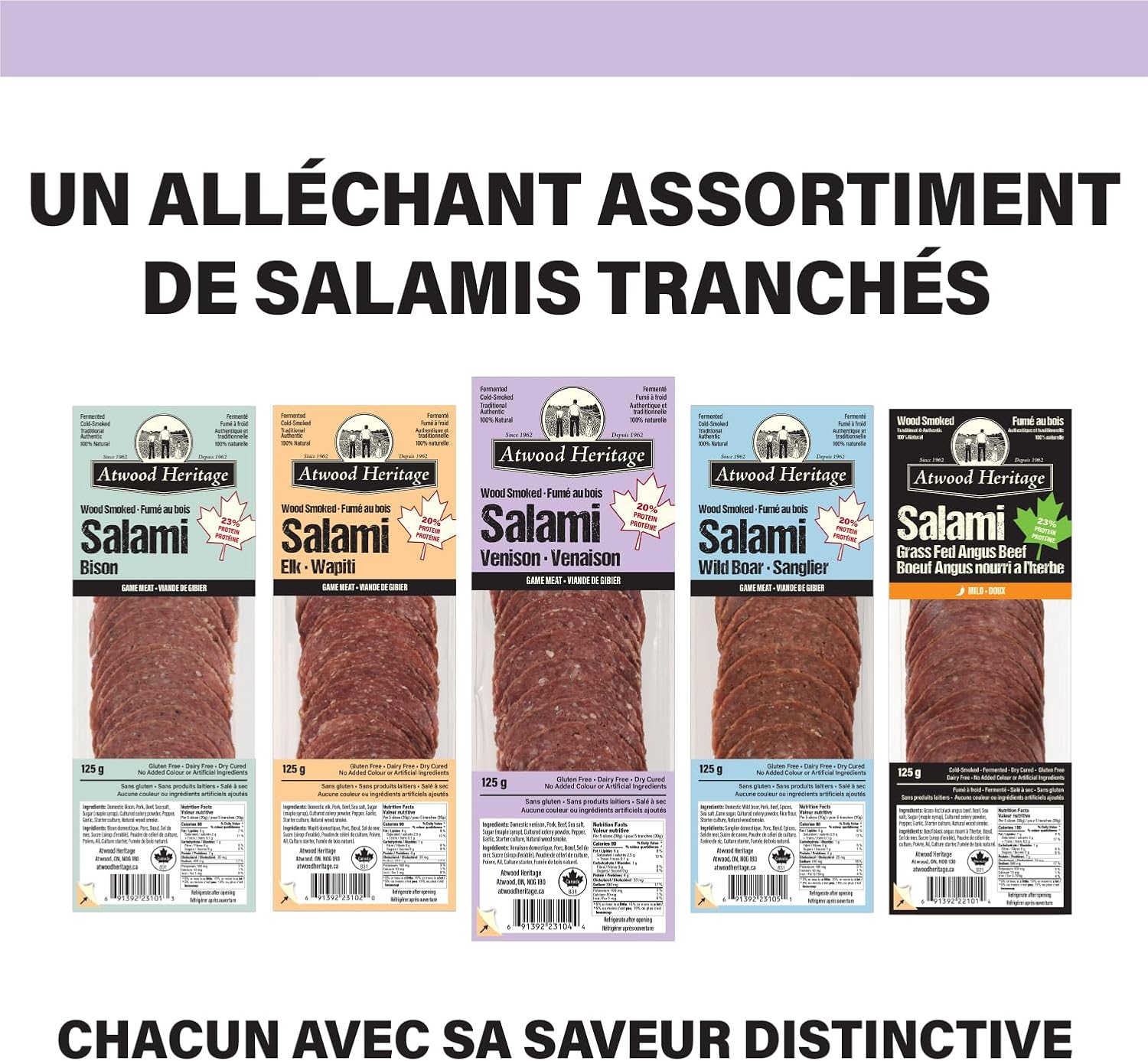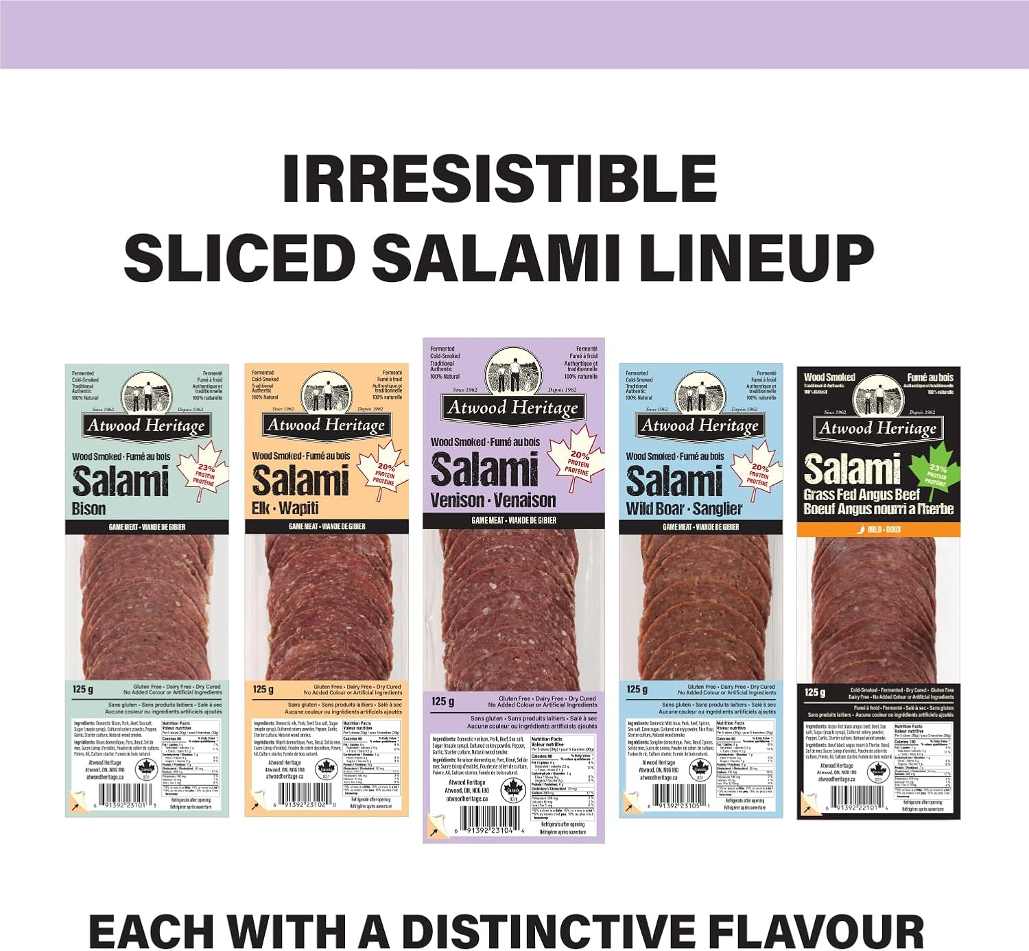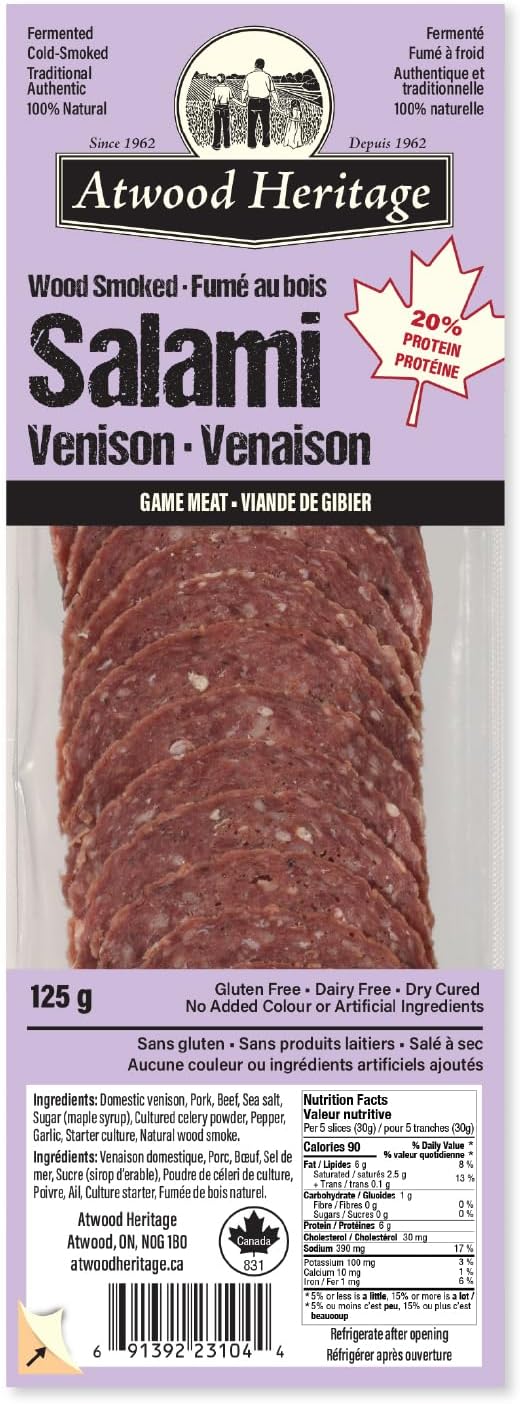 Atwood Heritage 鹿肉、豬肉和牛肉切片薩拉米香腸,125克,高蛋白,無麩質,無硝酸鹽,加拿大製造