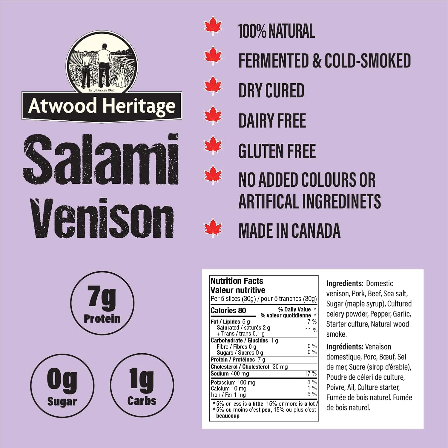 Atwood Heritage 野味切片薩拉米香腸 - 鹿肉 - 125 克 - 6 克蛋白質,自然發酵,冷熏,生酮友好,無麩質,耐儲存,加拿大製造