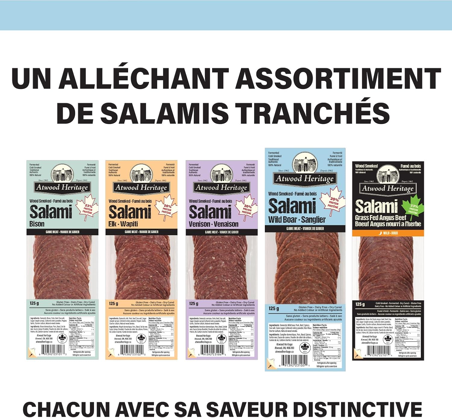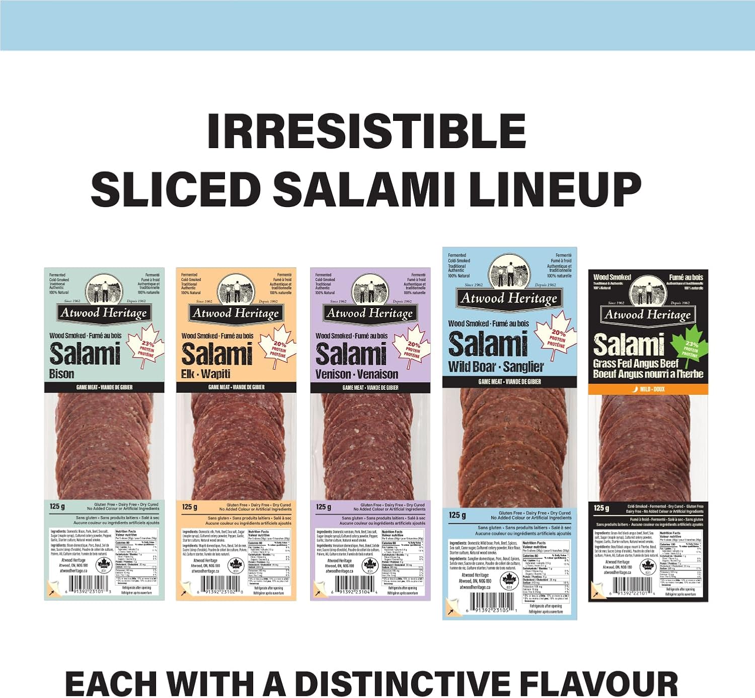 Atwood Heritage 野豬、豬肉和牛肉切片薩拉米香腸,125 克,高蛋白,無麩質,無硝酸鹽,加拿大製造