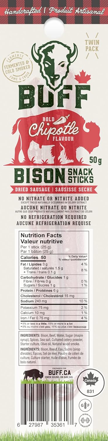 BUFF 野牛肉條,加拿大飼養,草飼蛋白質零食,每包 2 條,Chipotle 辣椒,50 克