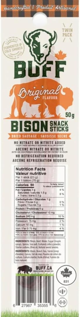 Buff 原味野牛零食棒,採用優質加拿大野牛製成,美味可口,富含蛋白質。這些天然瘦肉棒經過精心製作,調味簡單,充分展現了野牛濃鬱純淨的風味。每根 50 克的棒狀零食棒不含人工防腐劑或硝酸鹽,是便利健康的蛋白質來源,是忙碌生活、運動或戶外活動的理想選擇。