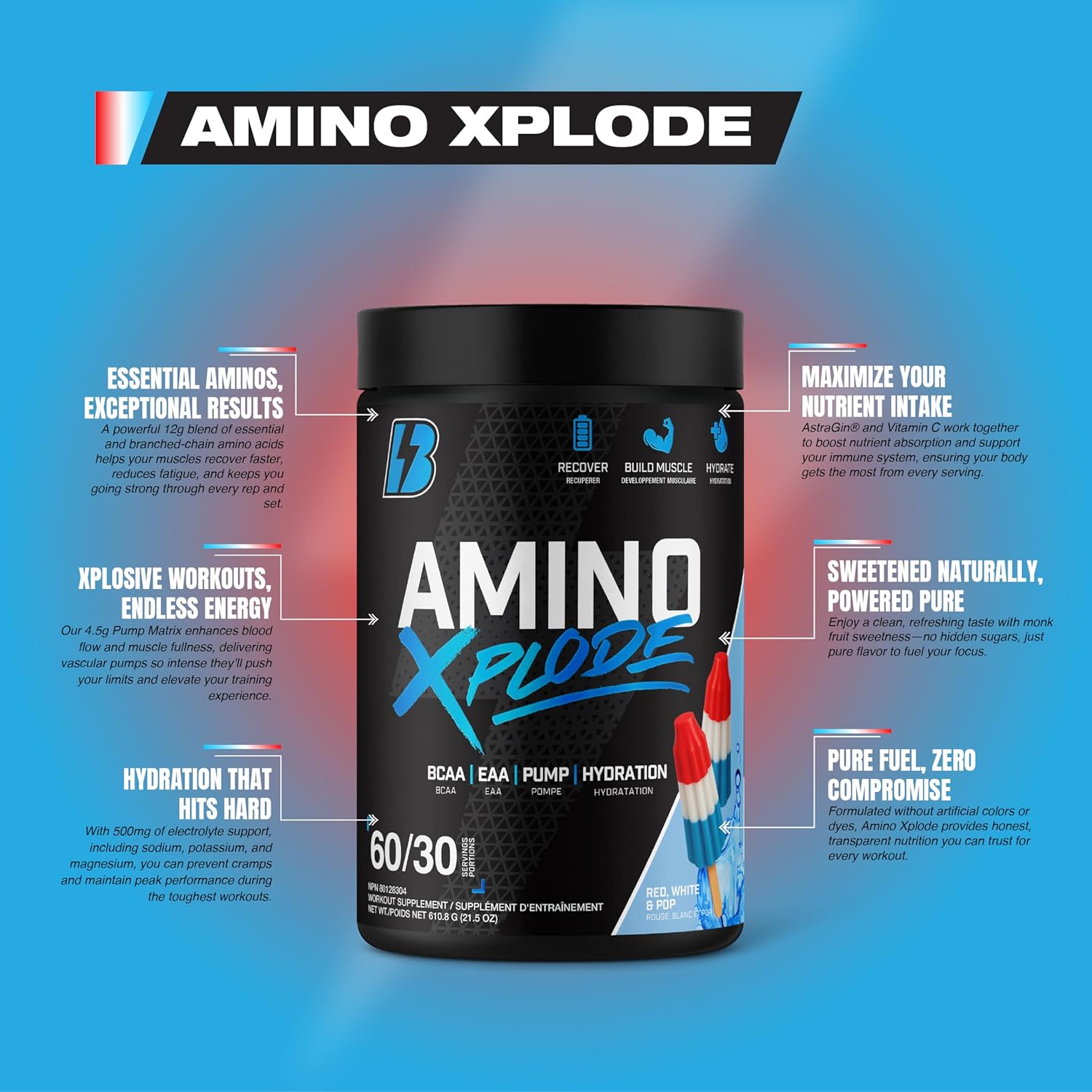 BULL Nutrition Amino Xplode – 12克 EAA/BCAA + 4.5克 Pump 和 500毫克電解質水合混合物 – 加拿大製造 – 60/30 份 – 火箭汽水口味(紅、白和汽水)