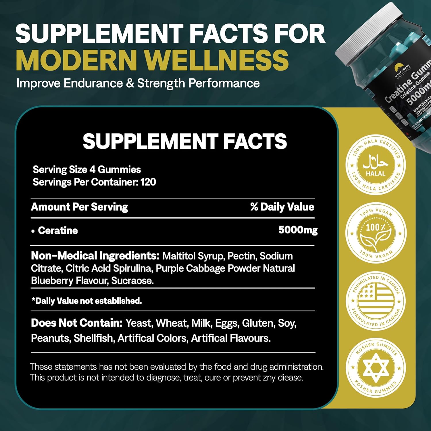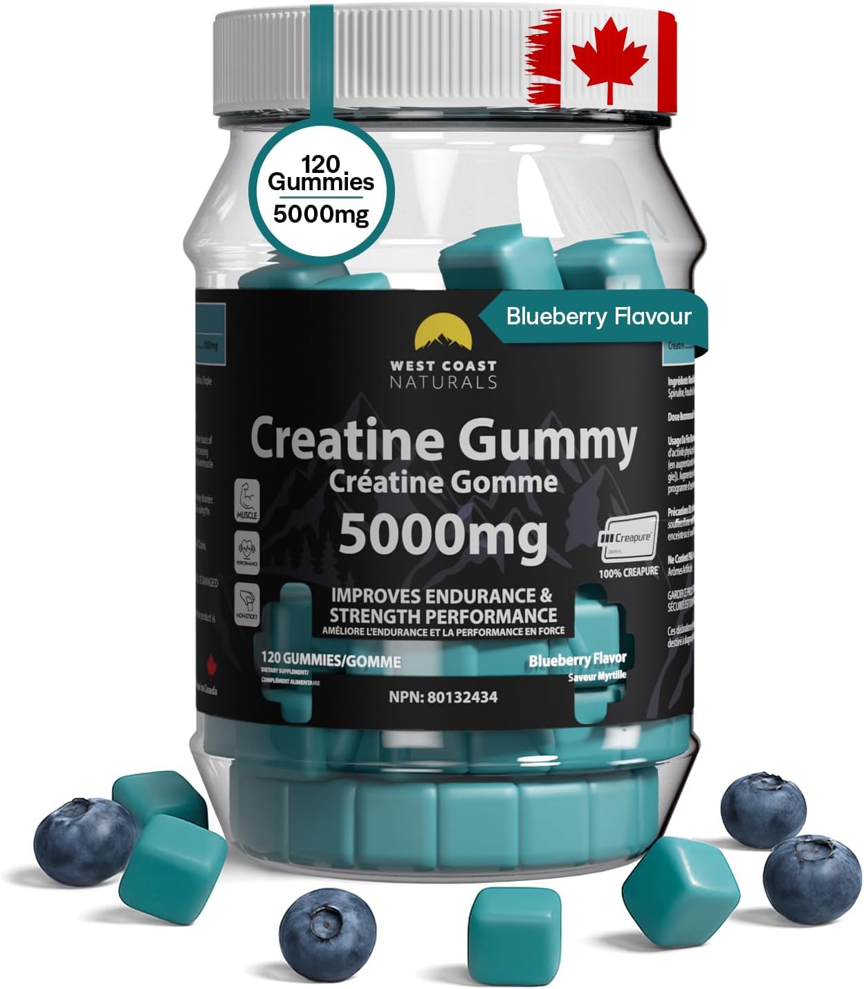 West Coast Naturals 肌酸一水合物軟糖 5000 毫克 - 藍莓味,無添加糖,男女適用咀嚼補充劑,純素 - 猶太潔食認證 - 120 粒
