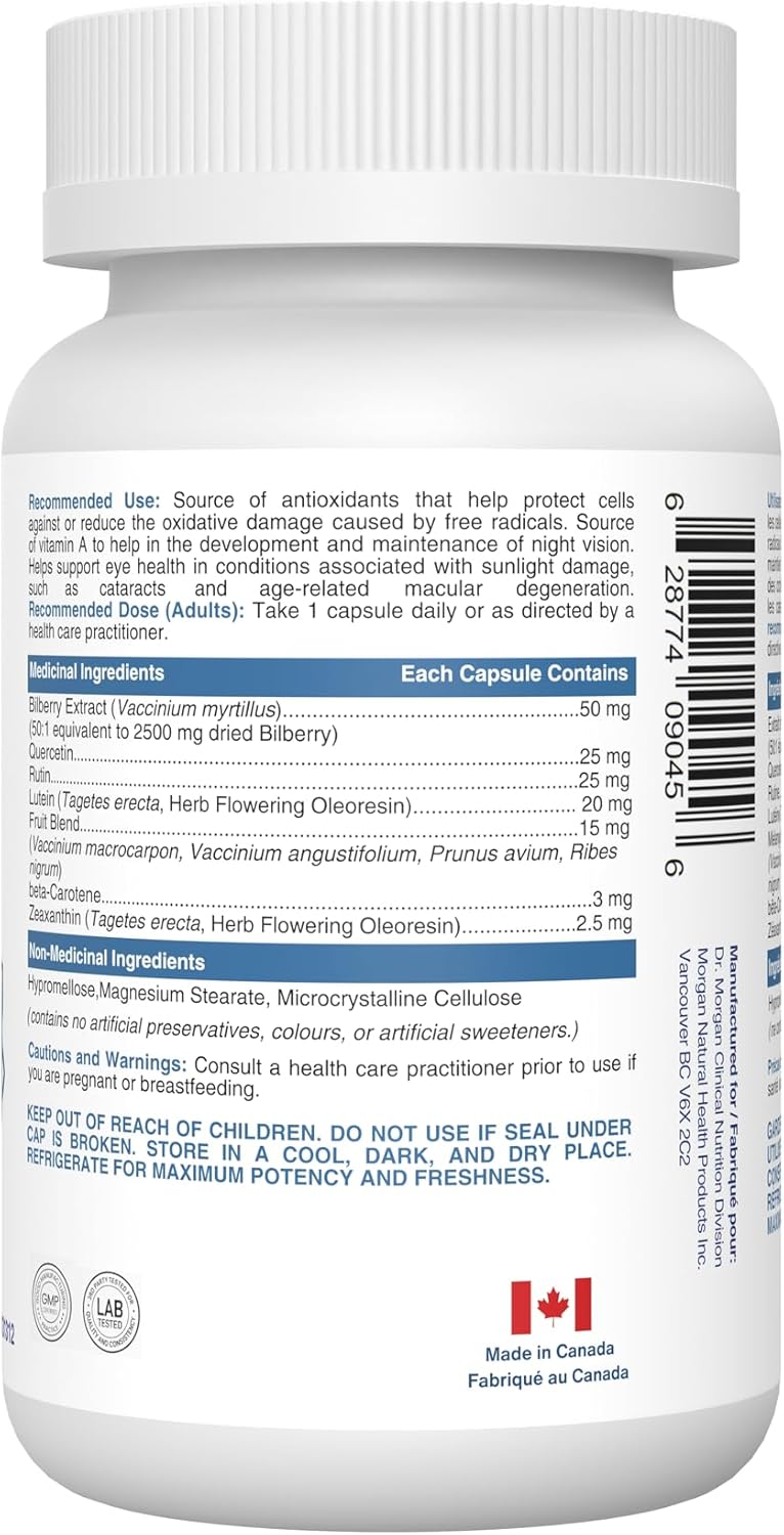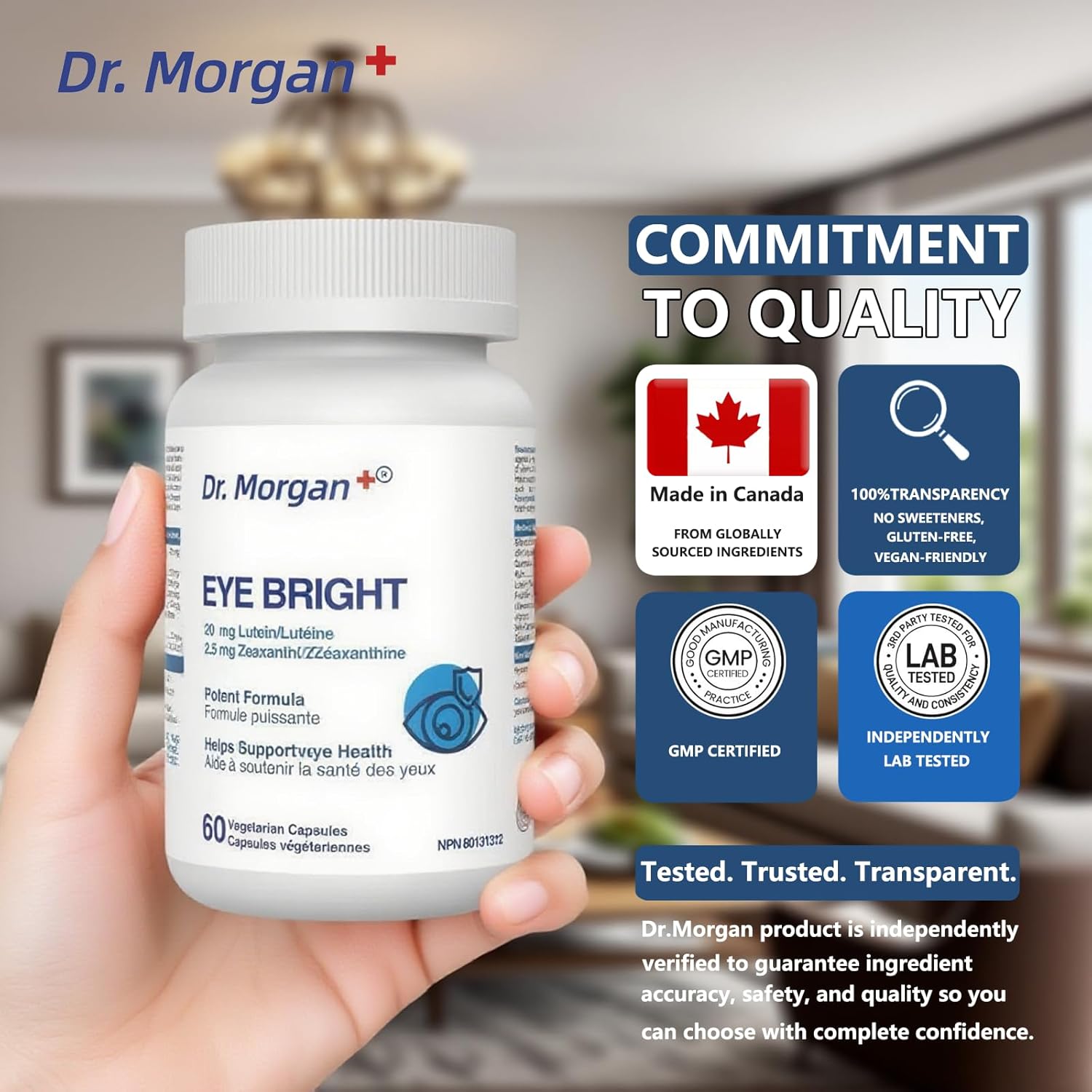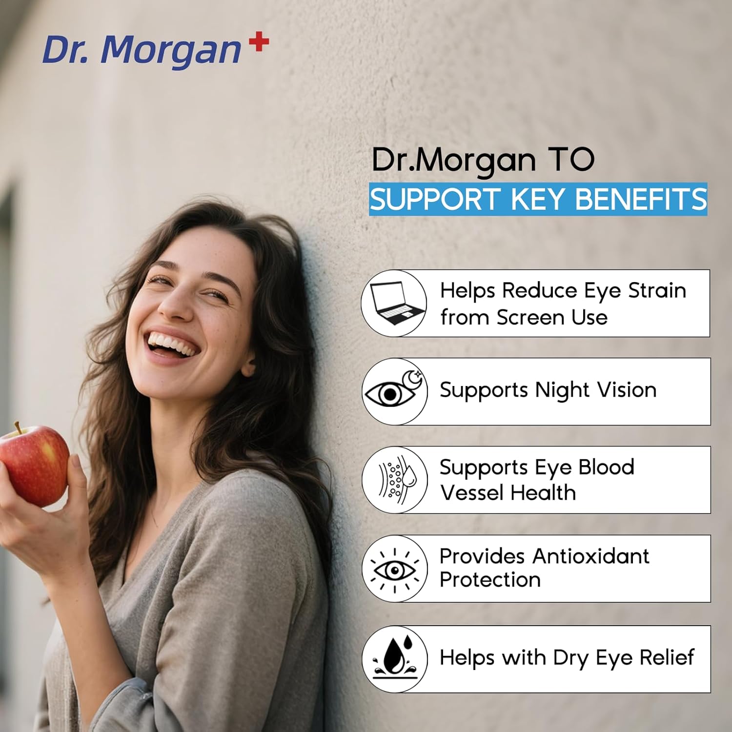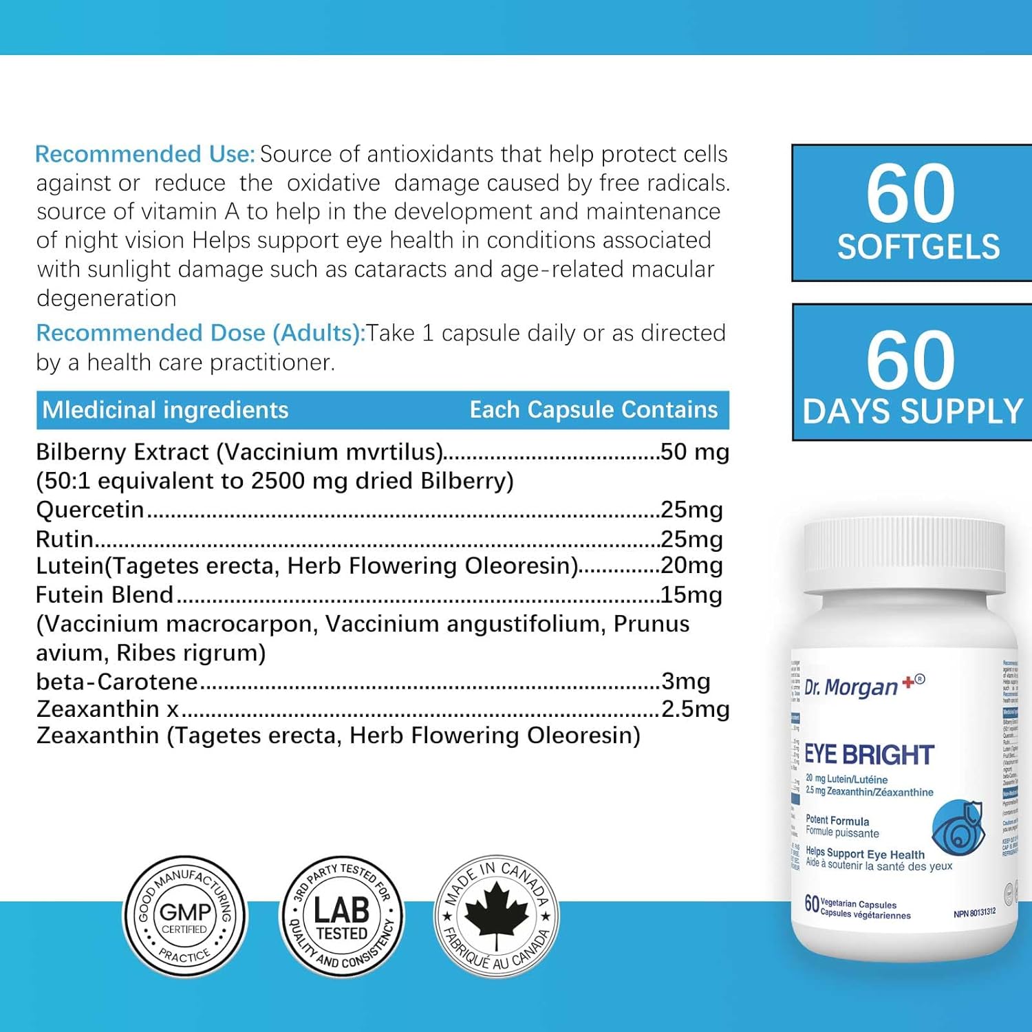 摩根博士 EYE BRIGHT 眼部補充劑,含越橘、葉黃素、玉米黃質和β-胡蘿蔔素 - 支持黃斑功能、夜視和抗氧化保護 - 60 粒膠囊