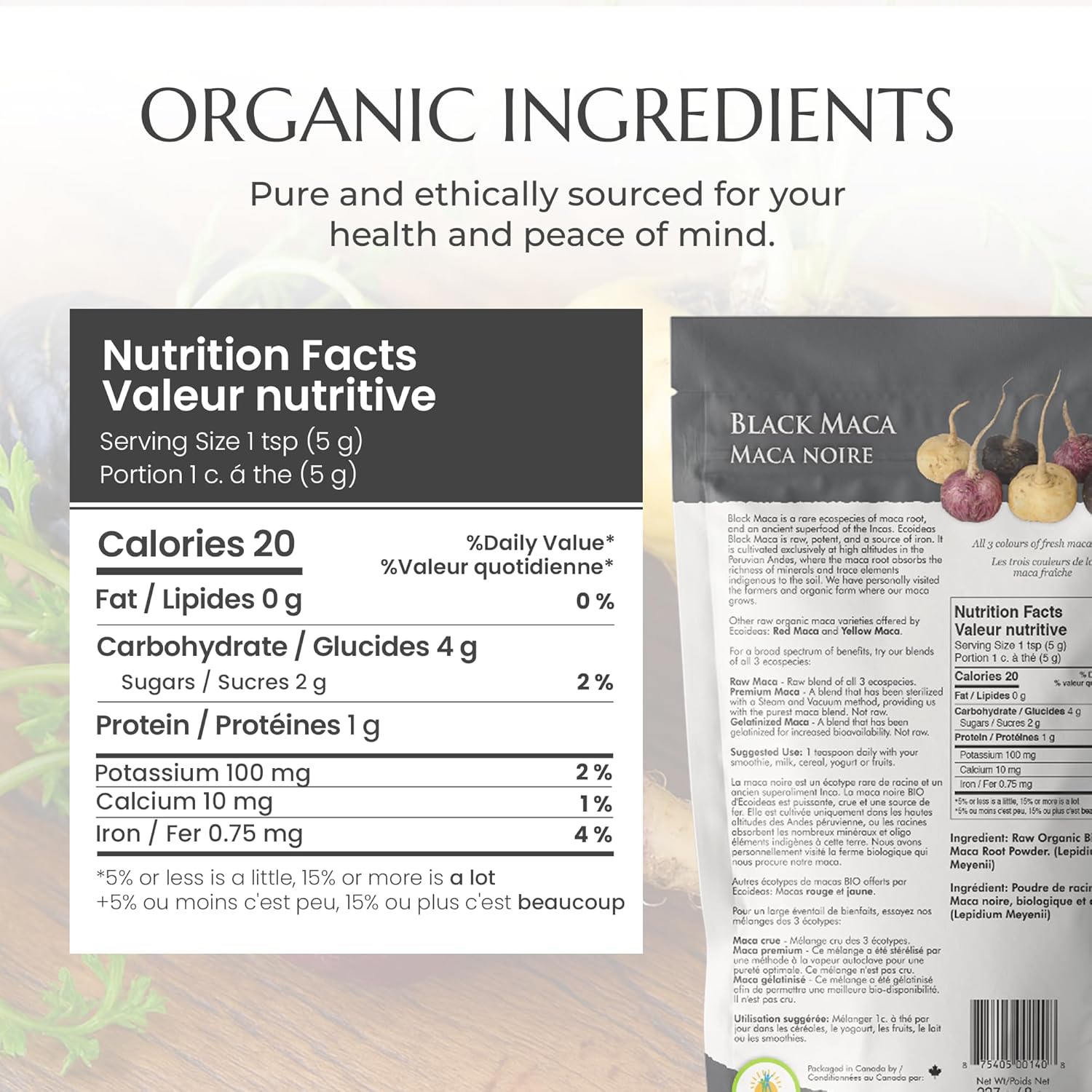瑪卡有時被稱為“秘魯人參”,因其營養價值極高而備受印加人推崇。瑪卡是一種適應原,以其增強能量、增強體力、改善情緒、緩解焦慮和提升性慾的功效而聞名。它富含必需礦物質、必需脂肪酸 (EFA)、氨基酸和多醣。瑪卡根含有超過55種天然存在的有益植物化學物質,與人體的自然節律協同作用。瑪卡根有助於重建虛弱的免疫系統,補充營養不良的身體礦物質,並增強能量和耐力。