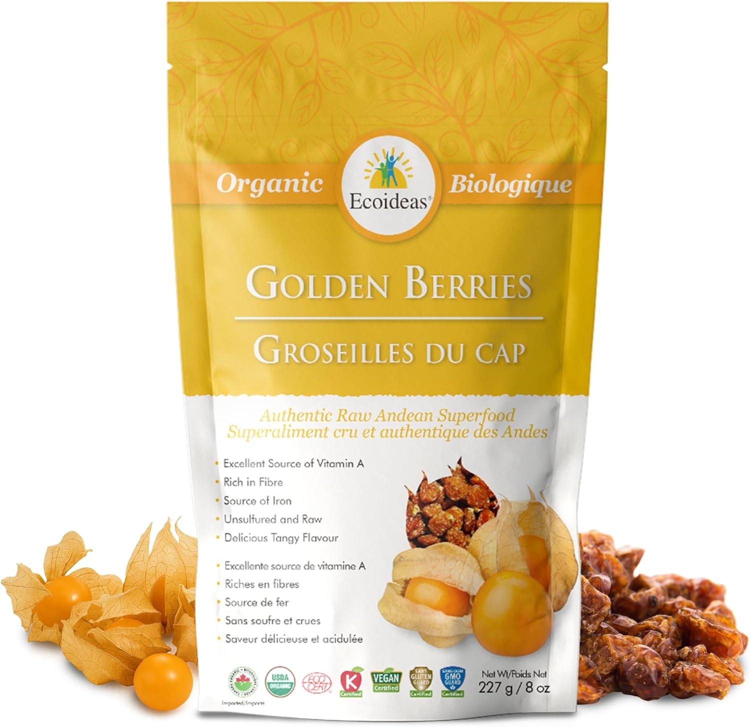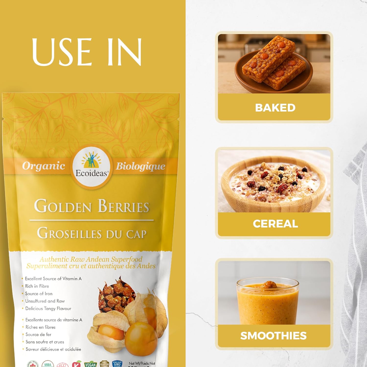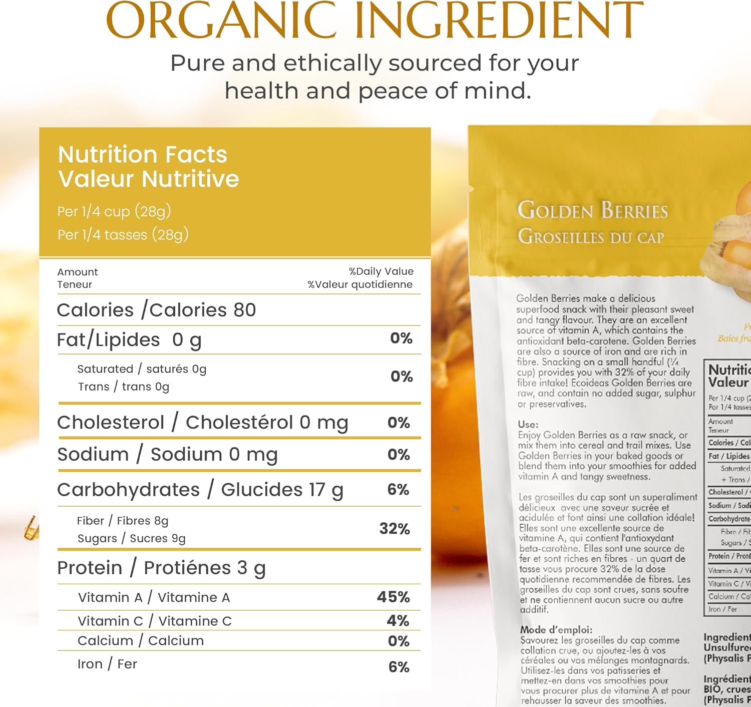 黃金莓果是一種美味的超級食物零食。它酸甜可口,口感柔軟。它們也是自製燕麥棒、沙拉和烘焙食品的理想配料。我們的黃金漿果未經加工,經過有機認證,是正宗的安第斯超級食品。黃金漿果不僅美味可口,還能提供身體營養。
