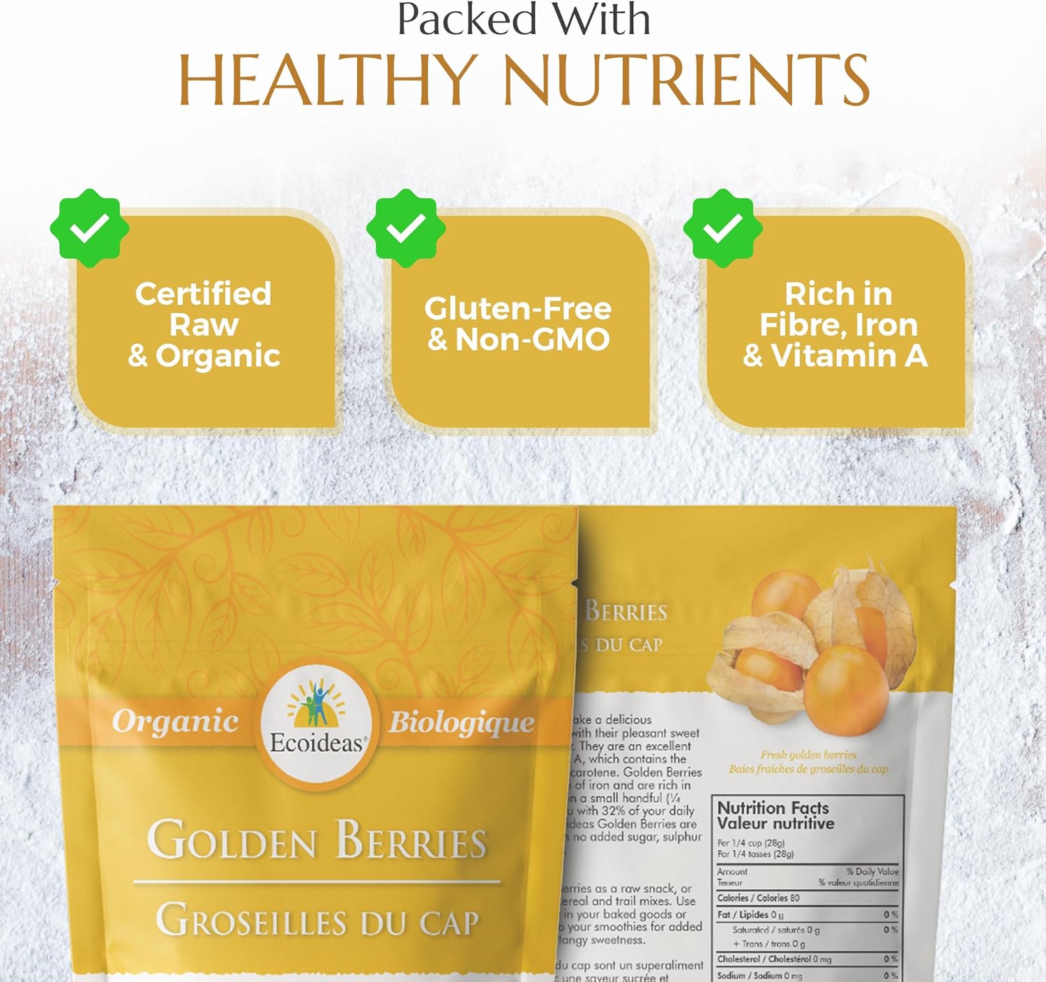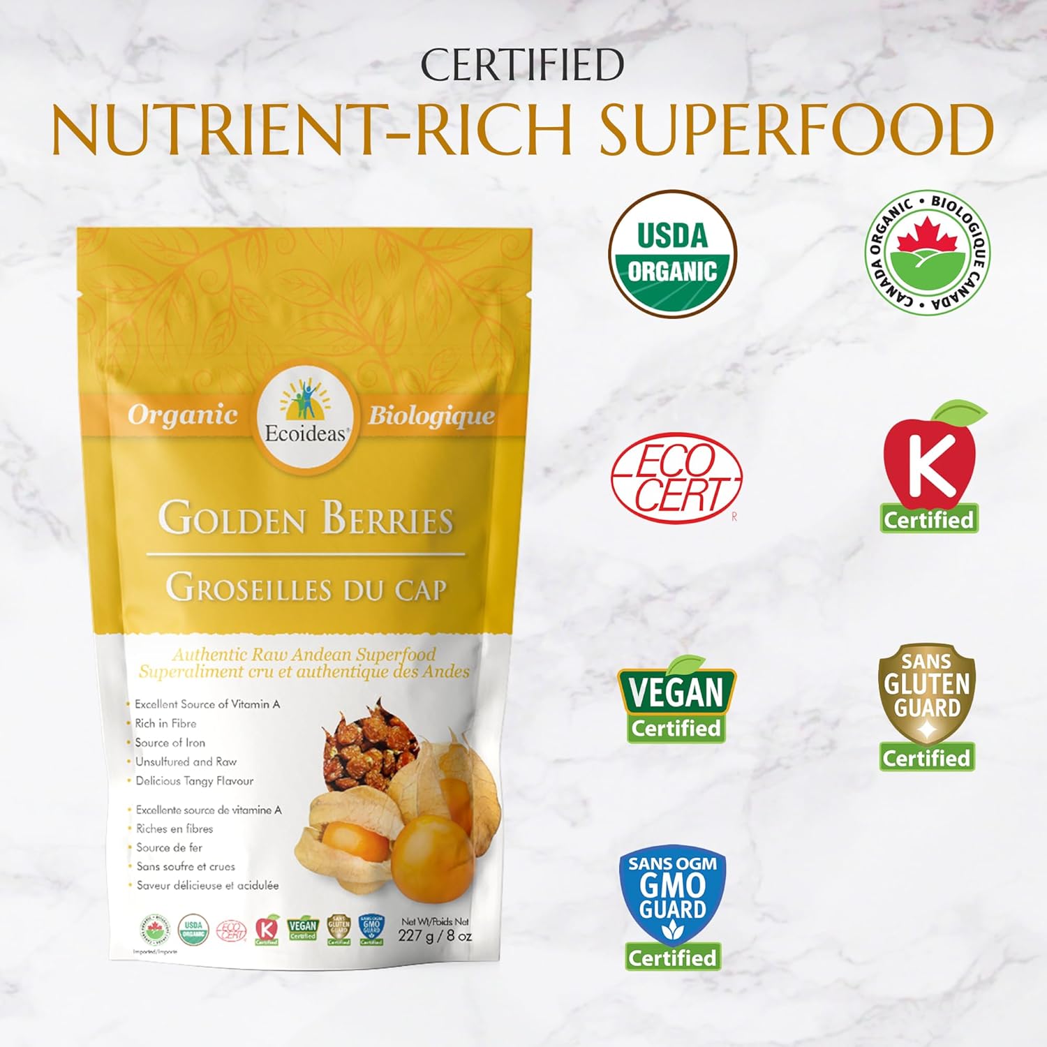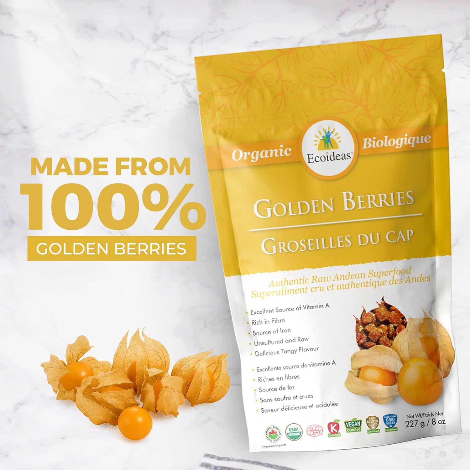 黃金莓果是一種美味的超級食物零食。它酸甜可口,口感柔軟。它們也是自製燕麥棒、沙拉和烘焙食品的理想配料。我們的黃金漿果未經加工,經過有機認證,是正宗的安第斯超級食品。黃金漿果不僅美味可口,還能提供身體營養。