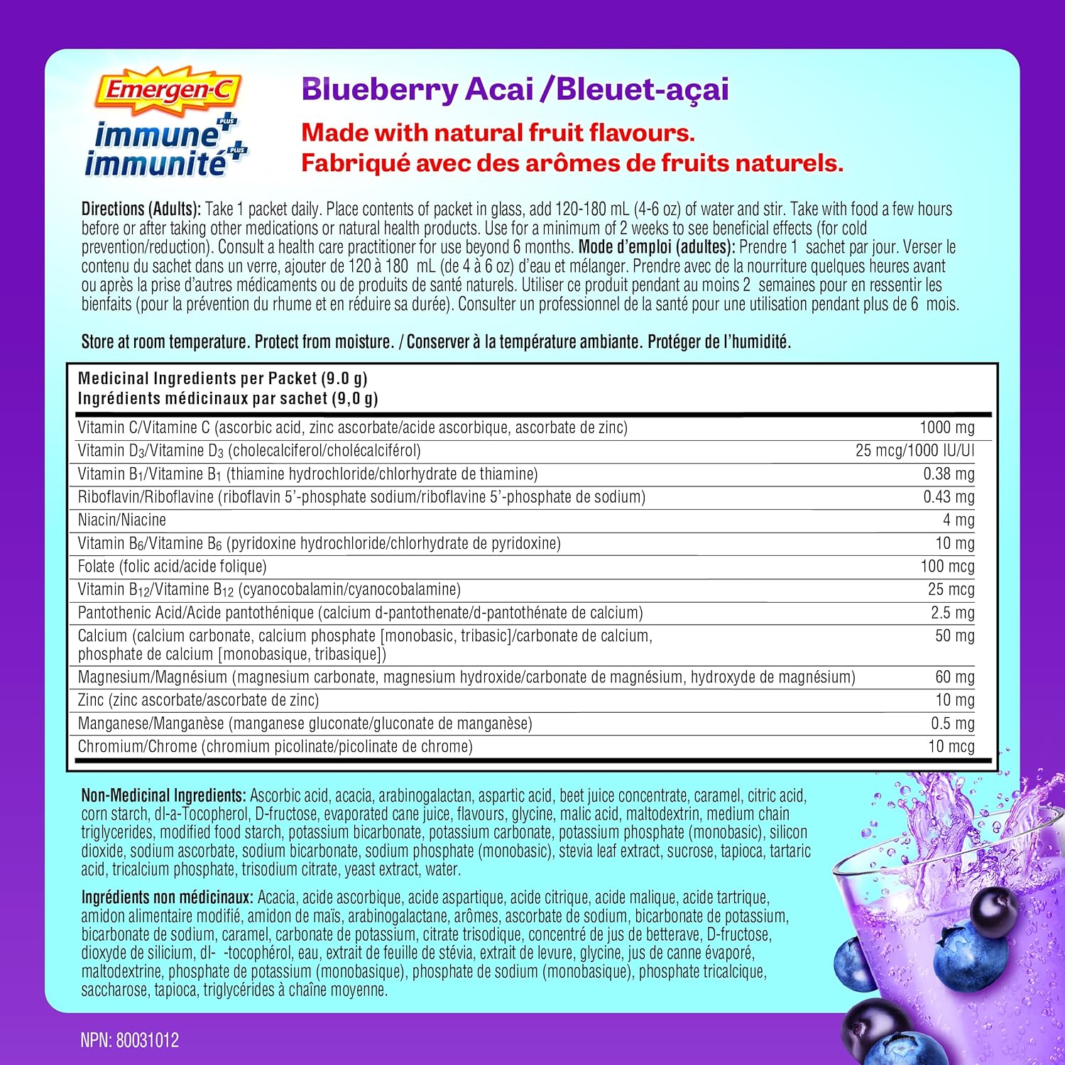 Emergen-C Immune+ 1000毫克維生素C粉劑補充劑,飲料混合物,免疫系統增強劑,藍莓巴西莓口味,24包