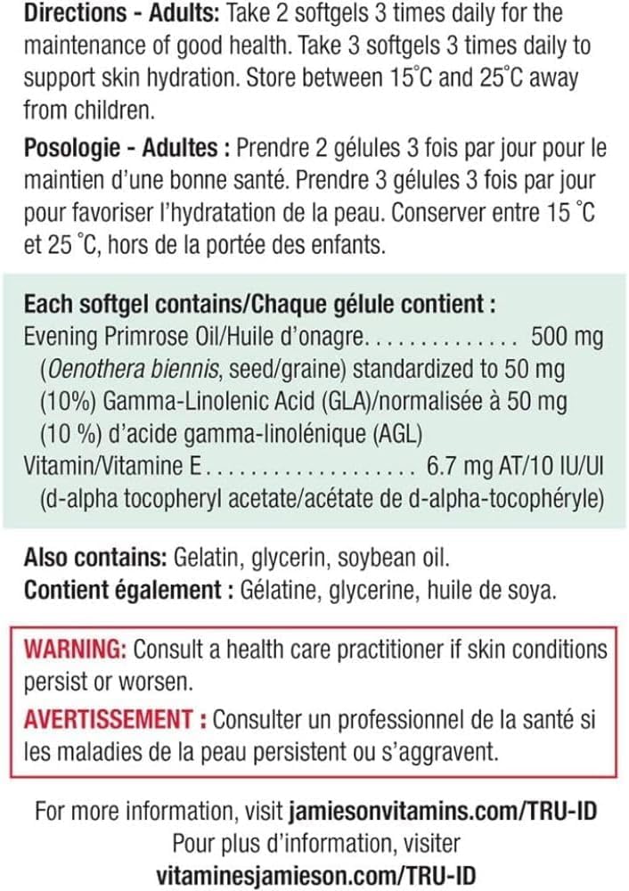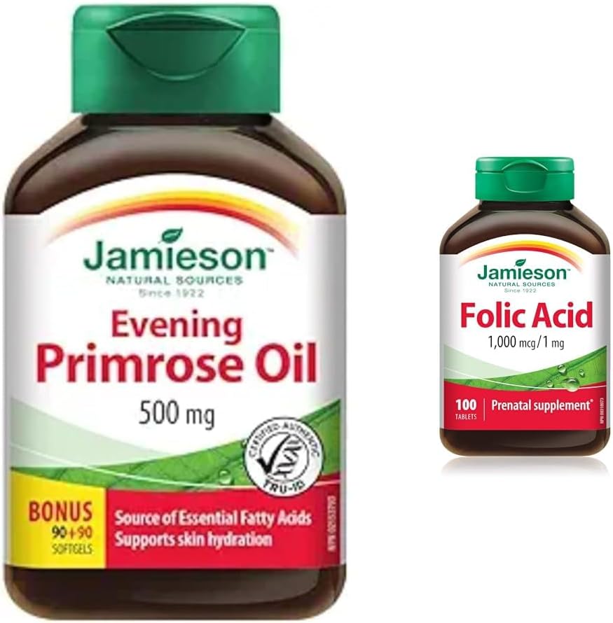 月見草油 500 毫克軟膠囊 - 含維生素 E,無麩質,180 粒(1 包)Jamieson 月見草油 500 毫克蘊含高效月見草籽,並添加維生素 E。本配方富含 Omega-3 脂肪酸和抗氧化成分,有助於維持整體健康。 Jamieson 葉酸 1000 微克 100 片裝 Jamieson 葉酸 1000 微克 100 片裝,每片含 1 毫克葉酸。對於計劃懷孕的女性來說,葉酸是一種重要的營養素,有助於降低懷孕期間神經管缺陷的風險。