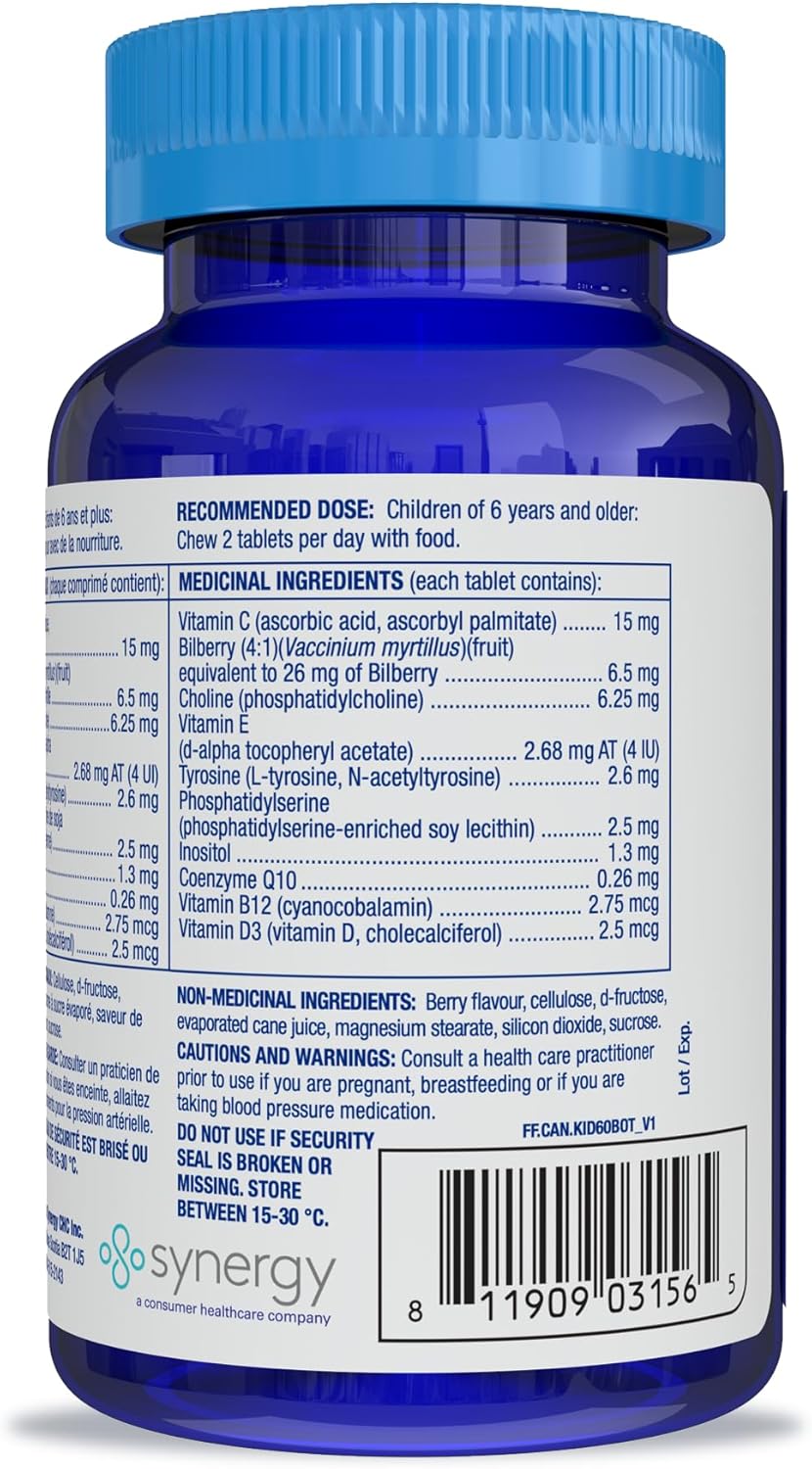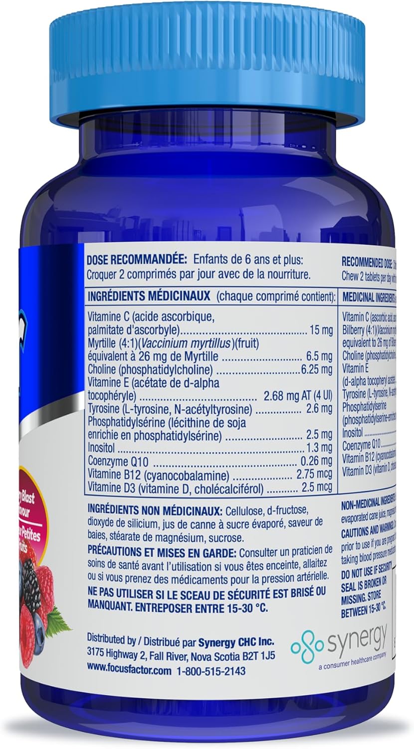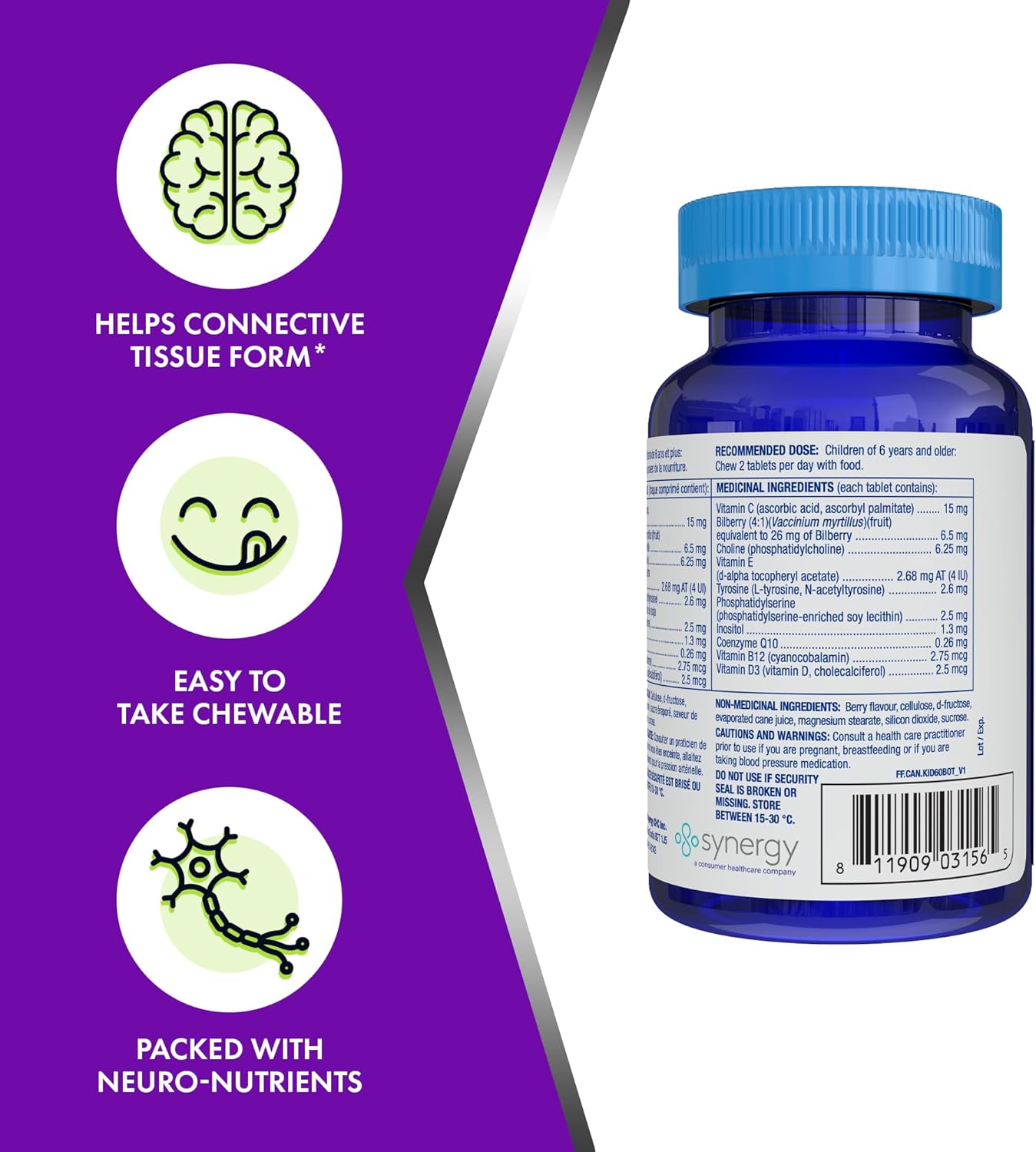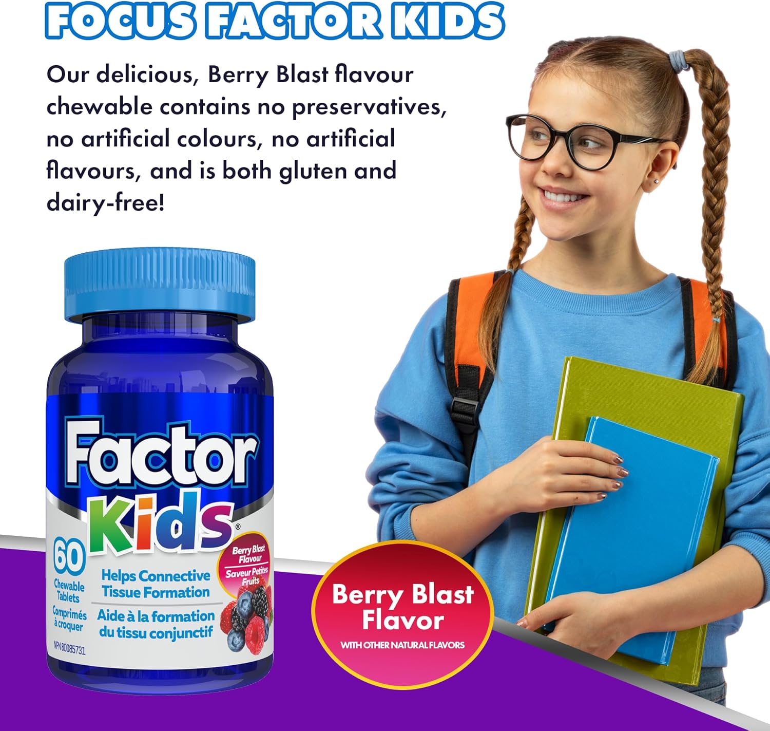 Factor Kids 咀嚼錠專為兒童配製,結合了磷脂酰絲氨酸、膽鹼、L-酪氨酸和越橘等優質成分以及維生素 B12、C 和 D3。