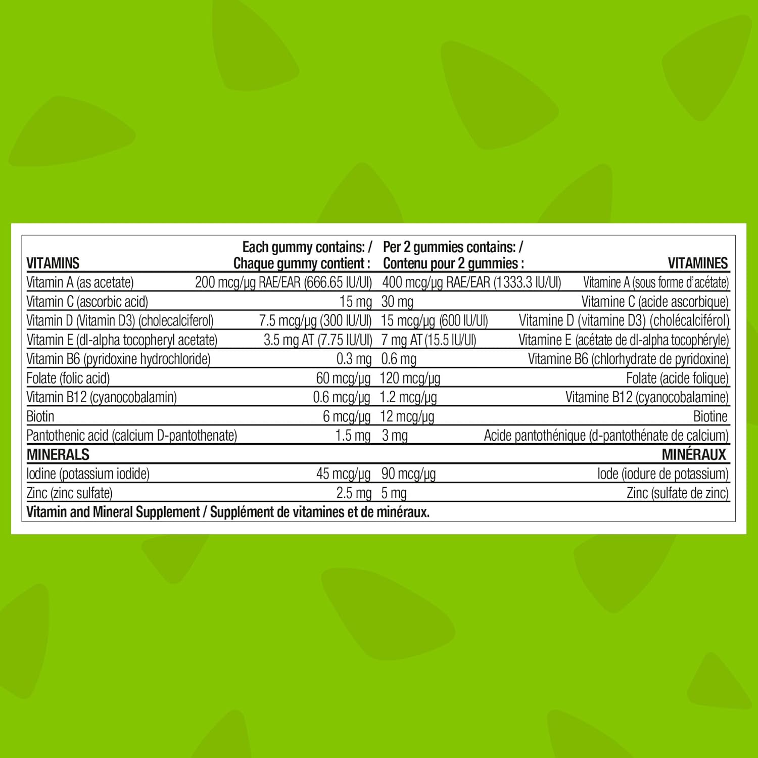 身為父母,您願意為孩子付出一切。因此,您總是會付出額外的努力來幫助他們保持健康。這其中就包括給他們服用 FLINTSTONES 複合維生素。全新升級*的 Flintstones 兒童全效軟糖,特別添加了維生素 A、C、D 和鋅,有助於增強免疫力**、眼部和皮膚健康,並幫助強健骨骼和牙齒。 Flintstones 全效軟糖富含維生素和礦物質,例如維生素 A、維生素 B6、維生素 B12、維生素 C、維生素 D、維生素 E、葉酸、生物素、碘、泛酸和鋅,為您的孩子提供常規飲食以外的營養支持。 Flintstones 全效軟糖有耐嚼的水果口味和有趣的人物造型可供選擇,不含人工甜味劑、合成 FD&C 色素、高果糖玉米糖漿和阿斯巴甜。 FLINTSTONES 是媽媽們首選的兒童維生素品牌***,深受家長和家長的信賴。 50多年來,Flintstones 複合維生素一直深受兒科醫生的青睞,為孩子們健康茁壯成長提供營養支持。三歲以上兒童:每日咀嚼一粒軟糖。四歲以上兒童:每日咀嚼兩顆軟糖。與食物同服,建議在服用其他藥物或天然保健品前或後幾小時服用。 * 與先前 Flintstones 複合維生素軟糖的比較 **有助於維持免疫功能 *** 資料已存檔