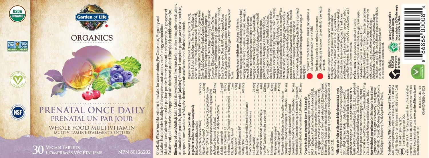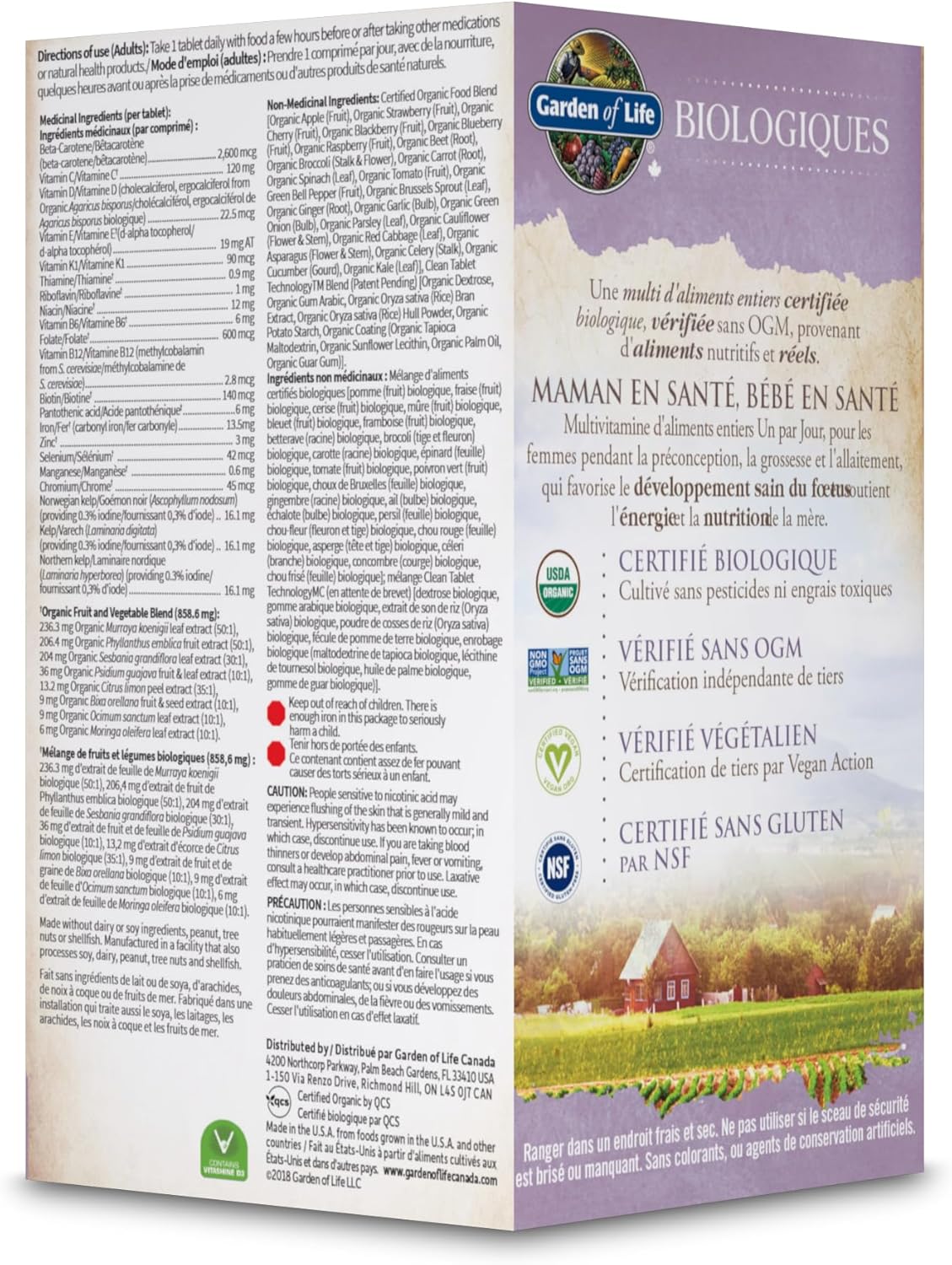 Garden of Life Organics 複合維生素 - 產前每日一次,30 片素食片。